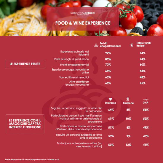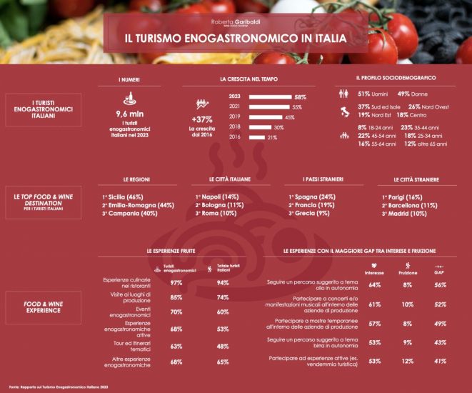 2023 is the year that food and wine experiences are topping the list of all the types of tourism, in Italy and in Europe. Food and wine tourists today total 58% of Italian tourists (37 percentage points higher than in 2016, when it was only 21%), and estimates are showing that the total comes to 9.6 million tourists. However, not just these tourists are targeting food, wine and beer-themed experiences, because now all tourists traveling to Italy want the same type of experience. About 7 out of 10 Italians have enjoyed at least 5 food and wine experiences during their most recent trips (+25% compared to 2021). Experiences range from culinary in restaurants (94% of tourists), visits to production sites (74%), events (60%), activity proposals (54%) and themed itineraries (48%), primarily at sea or mountain resorts. The top “pleasure spots” are Sicily, Emilia-Romagna and Campania for food and wine, while the top cities are Naples, Bologna and Rome, as the sixth edition of the “Report on Italian Food and Wine Tourism” by Roberta Garibaldi revealed. The Report was presented in a first preview to the press, at Palazzo del Touring Club Italiano in Milan. It furthermore revealed that the prospects for this year are positive, because, in spite of the crisis, 1 Italian tourist out of 3 claimed to have a larger budget to spend on purchasing food and wine offers, than in 2022. This means the offer is getting more and more interesting, but it needs a quality leap in terms of ideas, system, promotion and marketing, especially digital, by following current trends. These trends include having a variety available to choose from to enjoy all around experiences in new destinations, which must be “frictionless”; that is, more accessible and easy to purchase; the “The White Lotus” effect, or the influence of movies and TV series that are set in a specific territory, which is rapidly growing in choosing a destination; the new “green & social” identikit of tourists, who are more and more attracted to “responsible”, sustainable and environmentally friendly tourism; getting in touch with the local community to contribute to the social well-being of the territories and deseasonalize travel, which means there are tourists all year round, and the advantages are, obviously, saving money as well as choosing less crowded places; “longevity” tourism is instead becoming the opportunity to dedicate oneself to one’s well-being and learn to adopt healthier lifestyles, where rural territories are a favorite destination for a “digital detox”, away from the chaos of the city.