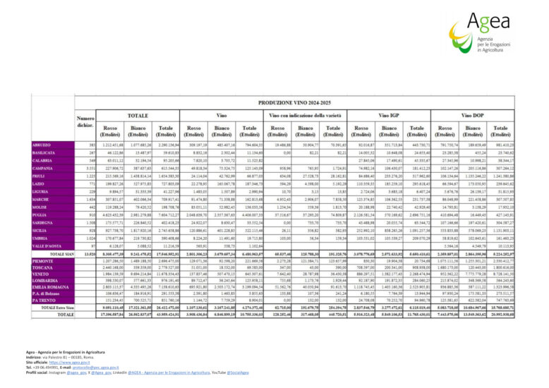 As of May 31, 2025, Italian wine cellars held 46.6 million hectoliters of wine, according to data from the ICQRF. This is practically the same amount as that produced in the 2024-2025 wine-growing season, equal to 43.9 million hectoliters, according to official figures released in recent hours by Agea, the Agency for Agricultural Subsidies under the control of the Ministry of Agriculture. This figure obviously does not change the situation, but it is slightly higher than last year’s estimates and comes in a market context that, as we have been saying for some time, is not favorable, with the 2025 harvest approaching with some concern in many areas, especially where production is mainly of red wines, which seem to be the most troubled, as evidenced in recent days by various areas of Piedmont, Puglia, and elsewhere, in view of a harvest that, as far as possible, is not expected to be poor, with the issue of “yield reduction” being discussed almost everywhere (as is the case every year) as the main tool for not further burdening the wineries.