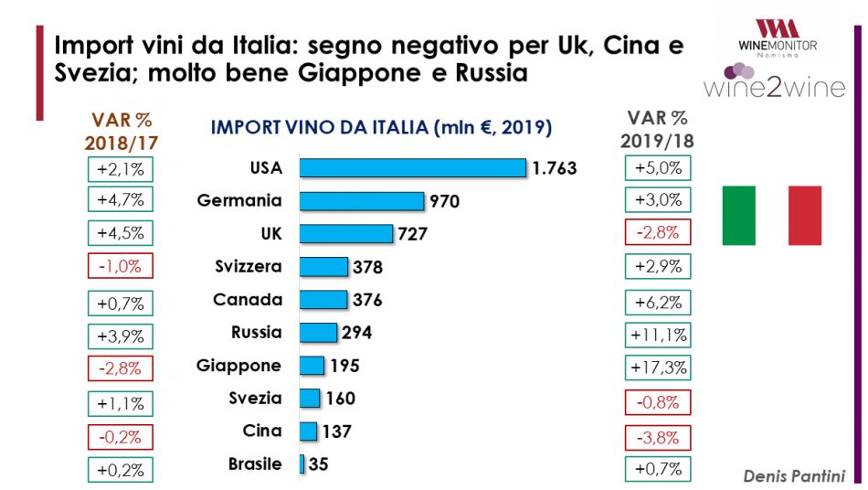 For the manager of the Vinitaly-Nomisma Wine Monitor Observatory, Denis Pantini, “2019 will see a further increase in exports of Italian wine, with significant increases in markets such as Japan, where the free trade agreement with the European Union has facilitated trade. All this in a market scenario that, on the contrary, is dominated by protectionist upheavals and trade wars that do not benefit the growth of exports, including Italy, at all. If it is established that the development of international trade allows growth in GDP and incomes, it is also shown that wine consumption is highly sensitive to changing incomes: where they grow, consumption increases more than proportionally and vice versa. In short, the risk that seems to emerge for the next few years is that of a general slowdown in international trade in wine that will necessarily affect our wines as well”.