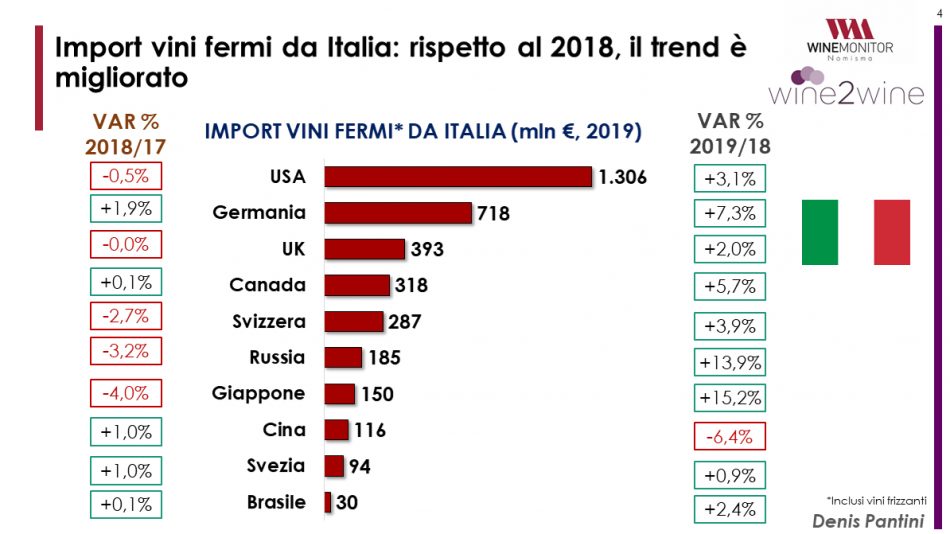 Italian wine in the world is growing in small steps, even if it doesn't run faster than in recent years. With the market data that tell of an improvement on the face of still wines, in difficulty in the recent past and the first signs of settling on that of sparkling wines (however growing), protagonists in recent years of an impetuous ride on the markets in the world. The summary is that the export of Italian wine is preparing to celebrate at the end of the year the goal of ten consecutive historical records, with a value of 6.36 billion euros and a growth of 2.9% on 2018. A picture that consolidates the Belpaese wine in second place among the world enological superpowers (Spain, third, will lose almost 7%) but that distances it from an increasingly leading France thanks to a commercial jump set at + 7.8% thus allowing them to to overcome the 10 billion euro export threshold for the first time. According to the estimates of the Vinitaly-Nomisma Wine Monitor Observatory on a customs basis, at the center of Wine2Wine is the Vinitaly training and networking event in Verona. According to the Observatory, which analysed the trends of the first 7 exporting countries (France, Italy, Spain, Australia, New Zealand, Chile and the USA), crossing the flows of the 10 main world countries of demand, 2019 will close with a positive result for the trade-in Italian wine, but even more so at a global level. The increase in imports of the “seven sisters of wine”, despite the uncertainty over duties and economic crises, will be 3.6%, with exceptional performances such as those of New Zealand (+10.2%) and Chile (+5.8%), while countries such as Australia (-0.3%) and the USA (-3.7%) turn negative.