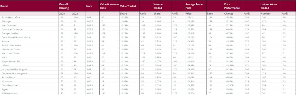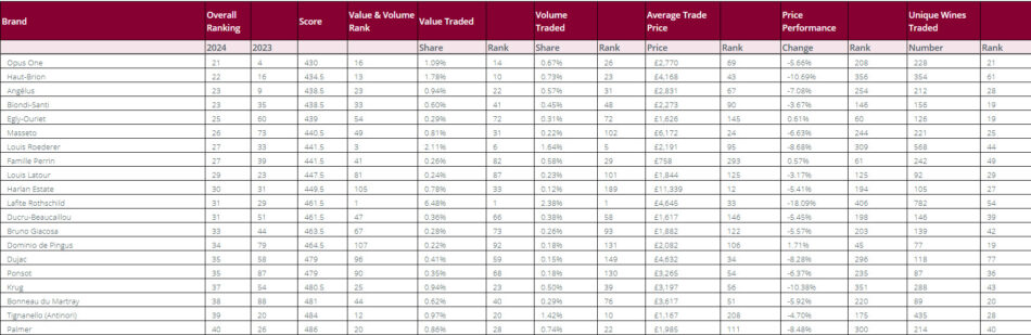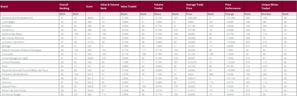 The “revolution” in the Top 10 continues alternating, however, with confirmations such as, from Burgundy, Joseph Drouhin/Drouhin Vaudon at No. 4 (was at No. 5 in 2023), Chateau d’Yquem (Bordeaux) moving from No. 2 to No. 5, Henri Boillot (Burgundy) at No. 6 (up from No. 8), Mouton Rothschild (Bordeaux) at No. 7 (to No. 12 in 2023), Penfolds (Australia) at No. 8 (+3 positions), Leroy (Burgundy) at No. 9 (-1 position on 2023), and Cheval Blanc (Bordeaux) slipping from No. 6 to No. 10. At the level of territories, Burgundy continues to be the leader with 30 labels but loses 7 from 12 months ago. Bordeaux has 25 (-5) while Italy, in third position, seals its own record with 22 labels, a good 9 more than 2023, with Tuscany scoring 9. total share, fifth overall, doing better than the 7.2% of 2023 and Piedmont right behind, and growing, with 4% (3.5 in 2023). Behind Gaja and Tenuta San Guido, among the top Italian brands, is Roagna, one of the top-rated and benchmark names in the Piedmontese appellation, at No. 15 (No. 46 in 2023). Preceding the Barolo griffe Giuseppe Rinaldi at position No. 18 (was No. 15 in 2023), while Giacomo Conterno “the house of Barolo Monfortino” rises to No. 20 (was No. 27). Also continuing to grow is Biondi Santi, cradle of Brunello di Montalcino and now of the Descours Family’s Epi Group, at No. 23 (it was at No. 35 in 2023 and even at No. 134 in 2022). A significant leap is also that of Masseto, Frescobaldi’s jewel, at No. 26 (it was at No. 73), and Bruno Giacosa, another spearhead of Piedmont winemaking, also rises to No. 33 (up from No. 44 in 2023).