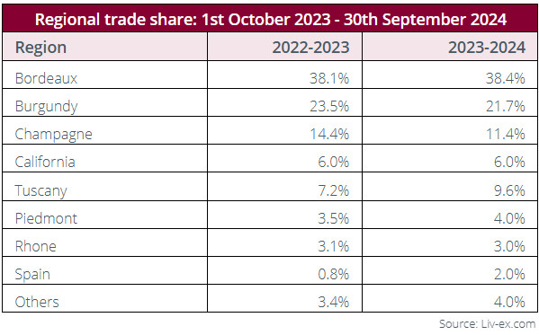 Italy, the Liv-Ex report points out, stands out for achieving the highest results in the 2024 Power 100, occupying 22 places, 9 more than last year, now on the “heels” of Burgundy and Bordeaux. And if Tuscany, and in particular the terroir of Montalcino, achieved the greatest position gains, a closer look reveals a heterogeneous set of Italian producers who made this year's list, demonstrating a lively wine scene where homogeneity lies in the quality of the proposal. More delicate is the discourse regarding France: for Liv-Ex, as last year, Bordeaux “certainly remains the best and most widely understood option: the mechanisms have remained unchanged and liquidity is still its strong point. However, in the current market, it is not necessarily the safest bet, particularly for recent vintages that have collapsed due to release prices virtually across the board”. Burgundy, on the other hand, while remaining the queen in the Power 100, is a “victim of its own success” for Liv-Ex. Given the high volumes and affordable prices that characterized the biggest rises in 2024, it is not surprising that Burgundy has fared poorly this year. This is reflected in the Burgundy 150 index, which has fallen 14.7% in the past year and 27.8% since its peak in October 2022”. On a general level, the 2024 fine wines market, Live-Ex points out, “was characterized by two trends. First, activity has remained high: the number of wines traded has remained steady. We see this in the “Power 100”: the transaction count for the 2024 list is 7.9% higher than for the 2023 list. Second, buyers tend to be reluctant to buy quantities of bottles that they cannot move quickly, resulting in a -6.5% drop in traded volumes”. The conclusions highlight how “as confidence has receded from the market, players have turned to brands that represent the least risky bets”. But while last year the biggest certainty seemed to be “Bordeaux, this year it is brands that share many of its traits, but not its terroir, that have risen to the top. Volume, liquidity, historic branding and prices that invite you to pop the bottles are their calling cards. And, as the market is still looking for a turning point, this course is unlikely to change in the short term”.