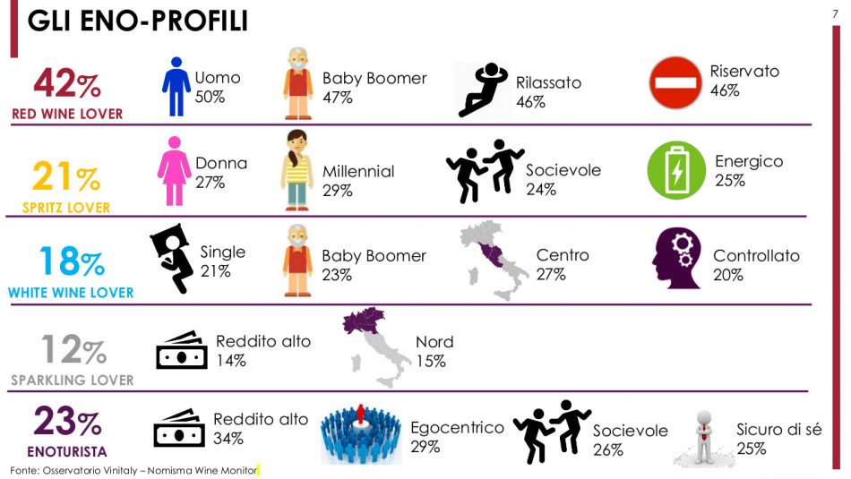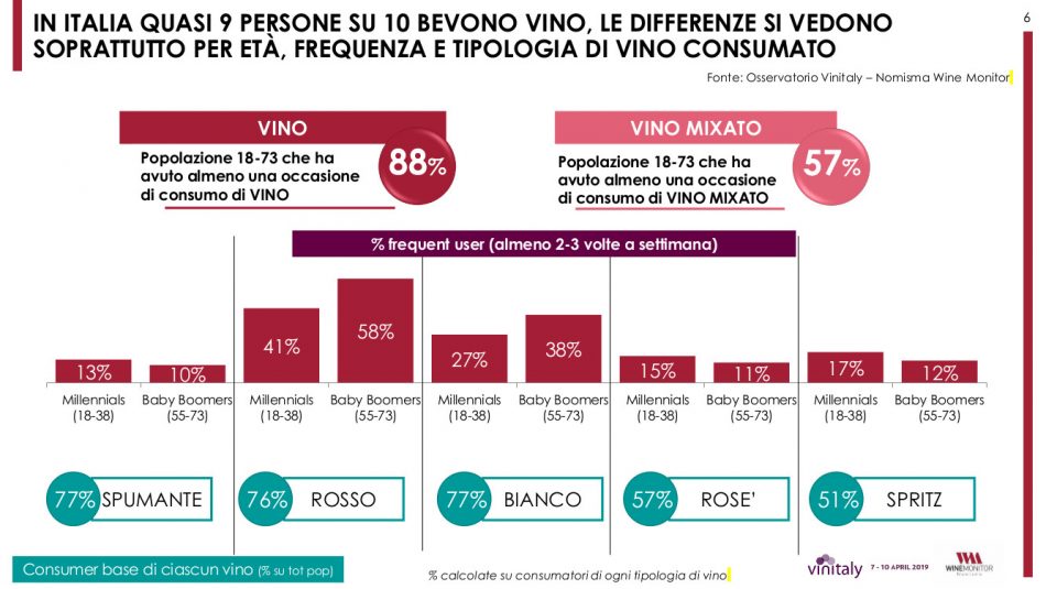 And if it is true that red wine remains the favorite on the table, preferences change along the Peninsula based on old and new consumption habits and the location of the different planted areas. Those who drink red wine do so in half of the cases at least 2-3 times a week, while for the other types the consumption is more episodic, especially outside the home. In metropolitan cities, where the penetration rate is equal to or slightly higher than the Italian average (91% in Naples compared to 88% in Italy) and the average age of consumers is lower, Rome drinks much more white wine than the Italian average (25% vs 18%), while reds dominate in Naples and Milan sparkling has consumption peaks well above the average, as well as rose wines in Milan and Naples.
