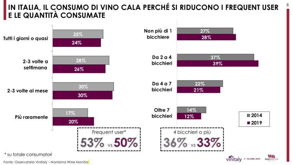 Passionate as love, traditional as Sunday lunch, popular as football. For Italians, wine is much more than an asset of Made in Italy: it is a bond between generations that involves almost 9 out of 10 citizens throughout the Boot. The survey “Mercato Italia - Gli Italiani e il vino”, carried out by Vinitaly with the Vinitaly-Nomisma Wine Monitor Observatory and presented today in a Vinitaly (until 10 April in Verona), traces the profile of the approach to wine and the state of health of the domestic market of the world’s leading producer country. We drink less (26% less than the volumes of twenty years ago) but in a more responsible way: the average is 2-4 glasses a week, consumed mainly at home (67%), especially by baby boomers (55-73 years, 93%), but the share of all generations is significant, with millennials (18-38 years) that already show a penetration rate of 84%. This figure is increasing both at home and away from home. We drink less, therefore, but the wine market keeps and produces a value for consumption that, according to the analysis, is estimated by the Observatory at 14.3 billion euros (figure 2018). A 650,000-hectare mega vineyard, with 406 denomination wines, 310,000 companies and above all a value for consumption on the domestic market that the Vinitaly Observatory - Nomisma Wine Monitor estimates in 2018 at 14.3 billion euros, for a volume of wine sold equal to 22.9 million hectoliters. Compared to 2017, there was a growth of 2.8% in value and substantial stability in volume (-0.4%). In comparing the top markets in terms of a value of consumption, Italy ranks fourth after the USA, France and the United Kingdom. For the president of Veronafiere Spa, Maurizio Danese, “for the first time, we have estimated the consumer value of the first market in the world for our producers. The figure, which exceeds 14 billion euros, says a lot about how much the sector impacts not only on the supply chain but also on services and on Horeca”. For the majority of the interviewees, wine is tradition, elegance, and culture, unlike spirits, associated with fun and monotony, or beer, where matching with friendship and everyday life prevails. “For Italians, wine goes beyond the status symbol - comments the Director General of Veronafiere, Giovanni Mantovani - and represents a fundamental element of the Italian culture, unlike other consumer countries.