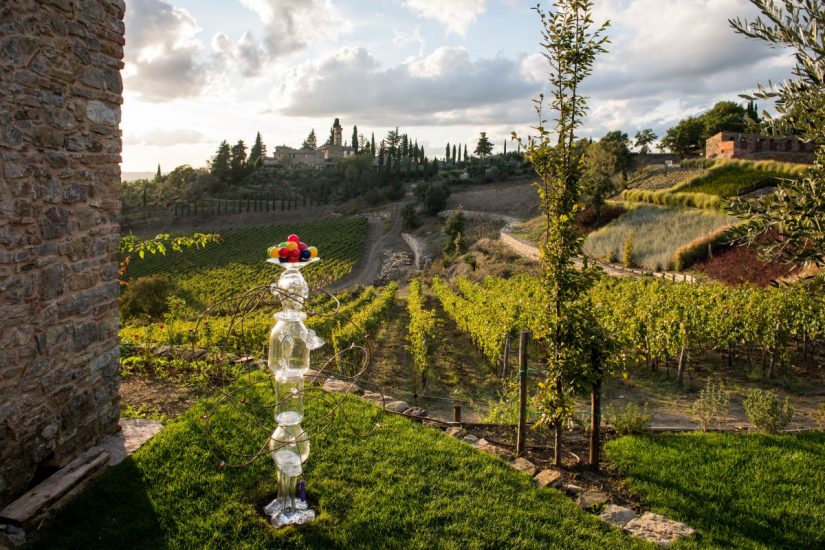 At the end of the fourteenth century, when the name “Chianti” appeared in an official document for the first time, that territory so beautiful it looks like a painting, exactly halfway between Siena, the medieval city par excellence, and Florence, the cradle of the Italian Renaissance, it really did begin to appear in paintings. The greatest Renaissance artists such as Botticelli, Donatello, Michelangelo, Leonardo chose it as a background, and Vasari depicted it also in the Salone dei Cinquecento of Palazzo Vecchio, in Florence. Today, Chianti Classico is one of the most famous Italian wines, and it is still the most important for artists in the world who have made it a real district, not only for wine, but also for International art. The “avant-garde” territory, where the partnership between wine and art is one of the most long-lived and successful examples, thanks to wineries that continue the ancient tradition of cultural patronage and also to places, often new or little known, that become exhibition spaces hosting the works that the most famous artists create on location. Just to name a few: Castello di Ama for Contemporary Art; Nittardi, and its labels-works of art; the Chianti Sculpture Park; Pievasciata B.A.C. Borgo d’Arte Contemporanea; Cantina Antinori in Chianti Classico and the “Le Radici dell’Arte” project of the Casenuova Estate. The result is truly exceptional for wine lovers and for art lovers all around the world.