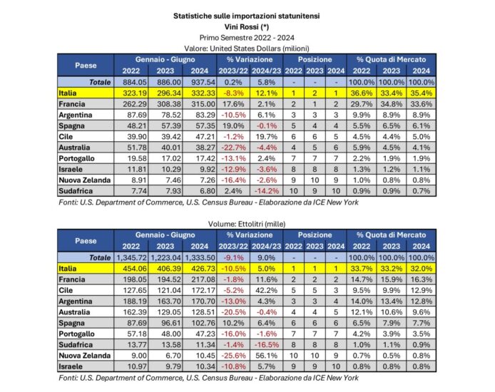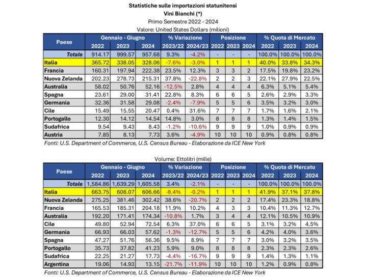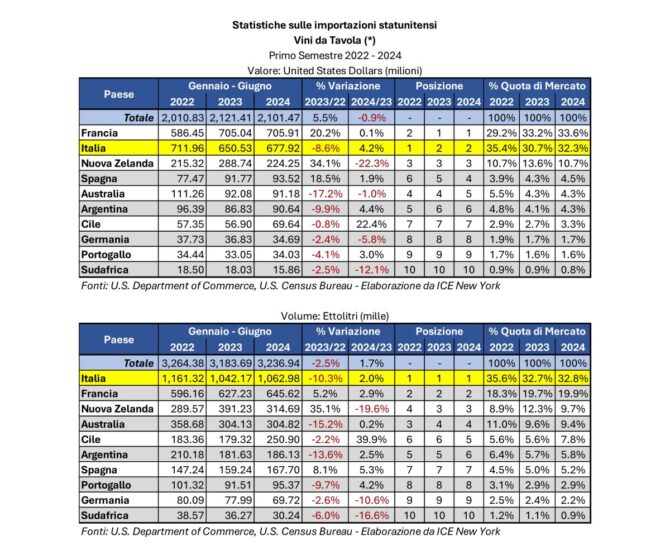 Completing the panorama, Ice further explains, are rosé wines, which, however, are in sharp decline, in general, in the U.S., and for Italy represent a small slice, with 28,000 hectoliters for $17 million in the first half of the year, in a segment, however, in which France dominates with more than 80% in volume and slightly less in value, and with Italy being second in market share, but below 10% in both parameters, but also dessert or fortified wines, whose imports to the U.S. are increasing in volume (277,000 hectoliters, +21.1%), but down in value ($299 million, -3.7%), with Italy also growing in this segment, with 53,600 hectoliters (+9.2%) for $105 million (+11%).