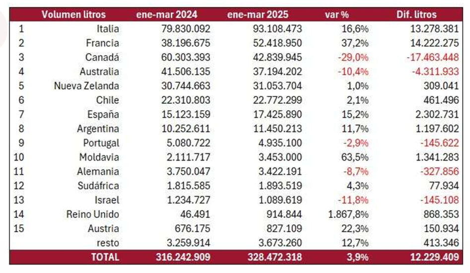 New Zealand is in third place in value, which however lost -19.5%, at 124.4 million euros. Canada came in third for volume (one of the first Countries in the world involved in the tariff war with the USA, ed.), at 42.8 million liters, at a -29% decrease.