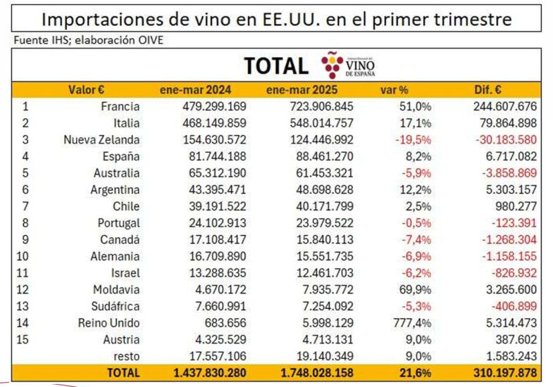 According to OIVE data, the difference in average price between Italian and French wines has been confirmed enormous. French wines at 13.8 euros per liter, while Italian wines at 5.8 euros (still above average). In any case, OIVE pointed out, wine imports in the USA were positive comparing the 12 months between March 2024 and March 2025, at a net growth in value (+14.6%), to 6.5 billion euros, and significant stability in volume (+0.9%) at 1.2 billion liters.