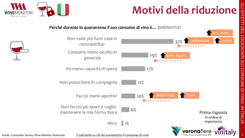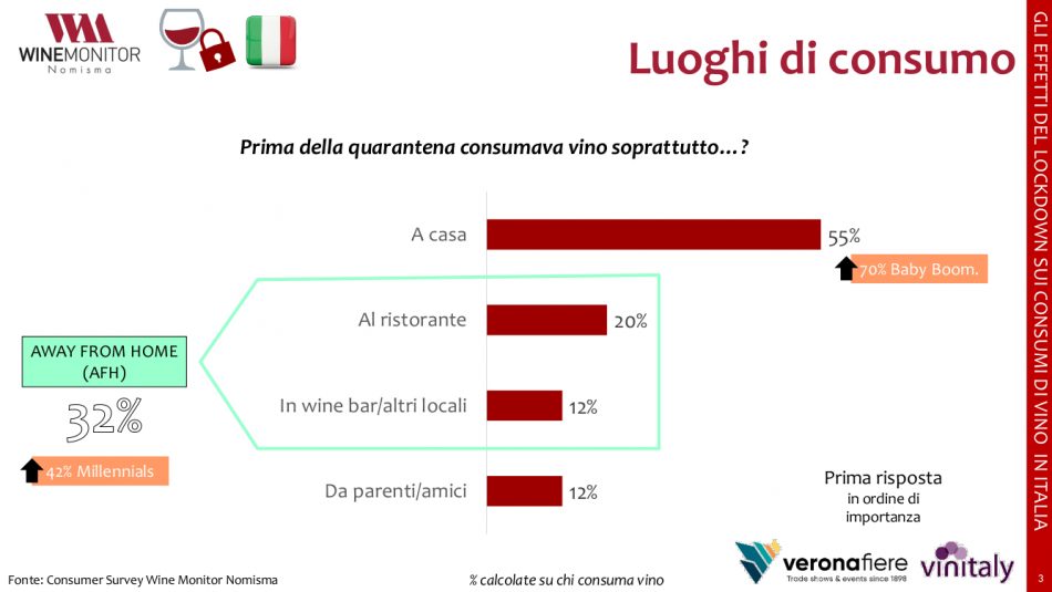 Denis Pantini, head of Nomisma Wine Monitor, adds that “although the lockdown has changed the way Italians buy and consume wine, the desire to return “to the good old days” seems to prevail over the current moment of crisis and future behavior, which will necessarily be marked by greater social precaution and distance. This is a very important asset in terms of confidence about the recovery and it should be preserved especially in light of the imminent phase 2, also because the estimated drop in Italian GDP for the coming months risks to have an impact on consumption in consideration of demand compared to income which in the case of wine is elastic, and as such, at risk of reduction because of the economic recession”.
