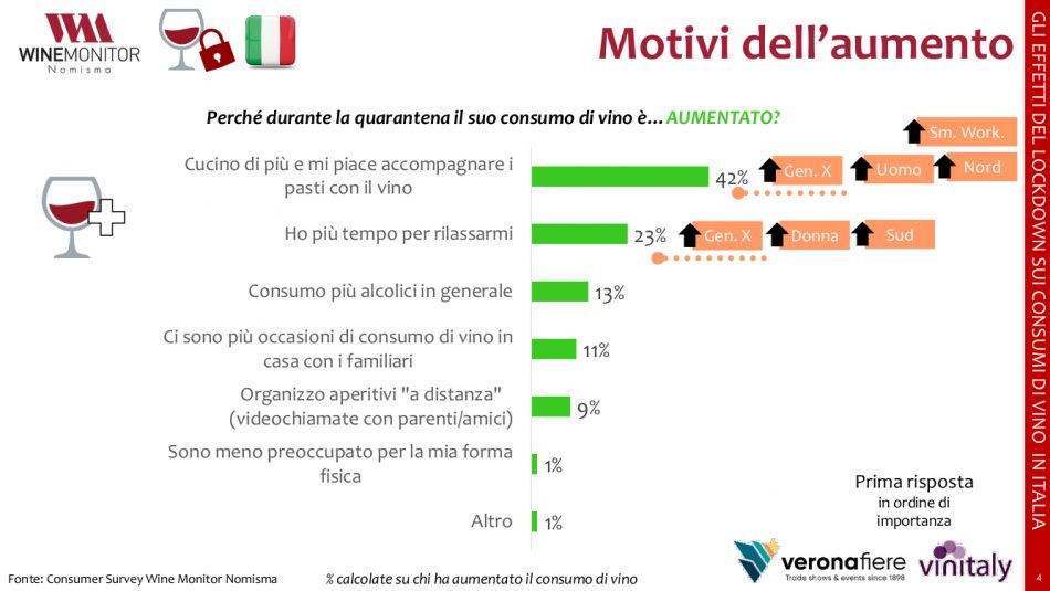 “Nothing will be the same as before”, the post-emergency refrain does not apply to the wine people: Italian consumers (85% of the population) declare, in essence, to be faithful to their habits already from Phase 2, compatible with their financial availability. In the meantime, it is not as before the dynamics of lockdown consumption: the glass is more half-empty than half full, and the growth of purchases in large-scale distribution does not compensate for the zeroing of consumption outside the home. And if 55% of consumers have not changed their habits, 3 out of 10 say they have drunk less wine (but also less beer) in quarantine, compared to 14% who indicate higher consumption. This is affirmed with great optimism by the survey - the first with an emergency Corononavirus focus, which will be followed by others in the coming months - conducted by the Vinitaly-Nomisma Wine Monitor “The effects of the lockdown on wine consumption in Italy”, carried out on 1,000 wine consumers of the Italian population. According to the research, the “after” will be like “before” for 80% of consumers. Or more than before, with the millennials forecasting a significant increase in consumption in particular of “mixed” wines (25% expecting to increase demand), demonstrating the desire to return to new normality with the usual aggregating elements, starting with the product and its places of consumption outside the home (restaurants, bars, wine bars), which are worth a slice of 1/3 of the sample in terms of volume (42% among the millennials).