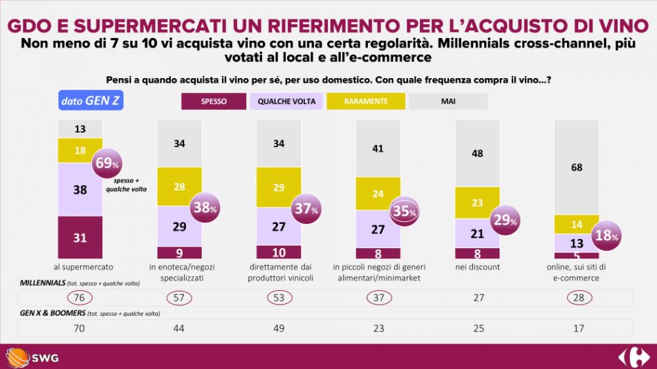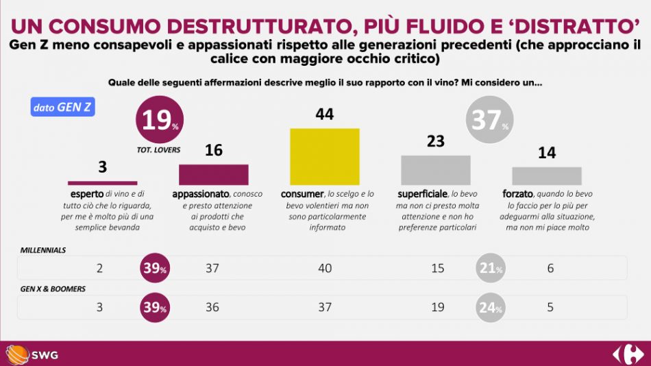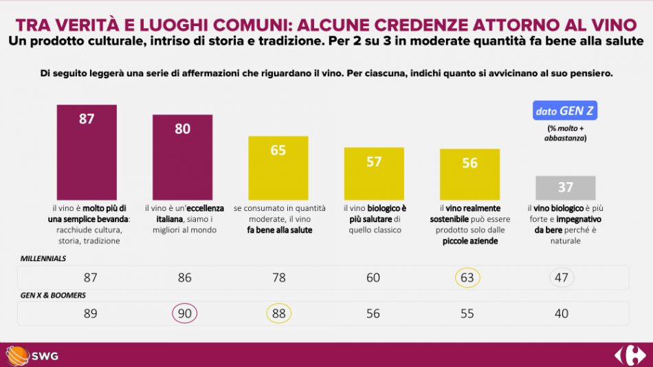 Younger people like wine, but they don’t know too much about it, despite considering it more than just a drink; on the contrary, for almost everyone it is a symbol of excellence and culture. Organoleptic characteristics and territory are the first elements of choice, while, belying many studies, aesthetics and notoriety are in the last positions. This is the extreme summary that emerges from the survey “Vintage 2.0: wine for digital natives” by Swg for Carrefour, in “Milano Wine Week 2022”, of which the French supermarket chain is main partner. And which confirms that if something has been understood about the Millenials, about Generation Z, the younger generation, there is still much to investigate. According to the data, young people particularly appreciate wine, which is unrivaled by Millenials (88%) and, among alcoholic beverages, is second only to beer for Gen Z (60%). However, both generations - 40% of Millenials and 44% of Gen Z - report that they are not particularly informed, revealing an interesting area of focus for large-scale retail, an outlet that as many as 69% of Gen Z and 71% of Millenials choose when it comes to buying wine. Wine, as mentioned, maintains its prestige even among the very young, confirming that it is much more than just a drink: over 80% of Millenials and Generation Z consider it an Italian excellence and 87% emphasize how it encapsulates history, culture and tradition. This means that, when it comes to wine, as many as 60% of Gen Z and 67% of Millenials are more interested in consuming it with awareness and buying it by paying attention - first and foremost - to organoleptic characteristics, the link with the territory where it is produced and the tradition it embodies. Among the different drivers of choice, aesthetics and bottle notoriety hold the last position. The growing attention of young people to the world of wine is confirmed by the active search for information during the buying experience. If most young people choose the supermarket, 37% of Gen Z and 53% of Millennials buy directly from wine producers. But what is most surprising for Gen Z, considering that we are talking about the so-called “digital natives”, is the figure for online: only 18%, in fact, buy wine on the Internet.