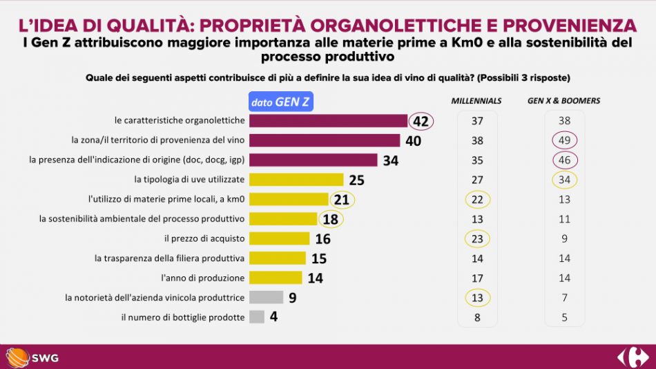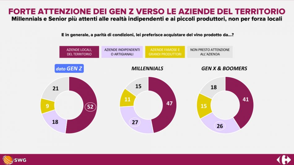 Decisive in purchasing habits is the presence of an expert who can tell them about the characteristics of different wines and recommend the bottle best suited to their needs. A service that 73% of young people seek and do not find in supermarkets, where they also find a lack of wines produced by artisanal wineries and small producers (51%) and typical wines at km 0 (50%). A figure that, on the surface, might be surprising but, in reality, perfectly, in line with the growing attention to conscious consumption of the new generations: in fact, 20% declare that they prefer to deal directly with sellers and receive advice, for a real buying experience.