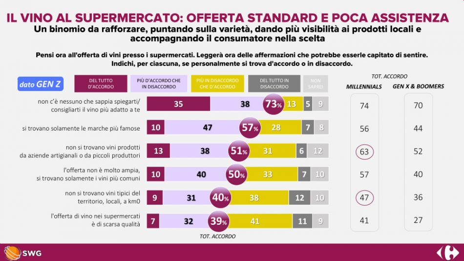 “We are pursuing an important path of renewal in the area of wine”, says Christophe Rabatel, Ceo of Carrefour Italia, “which concerns both a new language with which to communicate our offer and a mutual and constant confrontation with our suppliers. The results of this research show us that much more can be done to engage the new generations and make culture on a topic as important as wine. As large-scale retail operators we have a great responsibility in addressing the right messages and we are confident that we can do a lot to enhance this precious product in an inclusive and balanced way. For us, enhancing made in Italy also means contributing to the export of Italian products: the Carrefour Group has recently centralized and entrusted the Italy-based team with the responsibility of developing the strategy and purchases of Italian wine for all countries”.