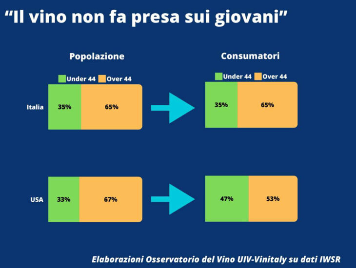 “Then, it turns out that the conviction – still explains the study – that “consumption decreases because of young people is false”. In America, exactly mature consumers apply the handbrake. While, among under 44 young people are more those who increased consumption (31%) compared to those who decreased it (26%), in the more advanced age ranges those who increased wine consumption represent only 9%, and raise to 29% those who decreased the quantities. In Italy, the drop seems to be crosser and more intergenerational, and involves over a quarter of population (27%) in both age clusters. But, also here, exactly under 44 (14% of those who increased consumption, against 7% in the age range over 44) partly moderate drop.