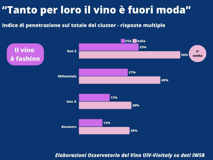 In this framework, the bond “food and wine” remains important, but seems to loose centrality for American and Italian young wine lover. If it is true that “wine exalts food”, according to most over 44, those who recognize in this affirmation, descend under half among Millennials and Gen Z. On the down side, in Italy the share of Italian very young people seeing wine as a “fashion statement” is exactly the double (56%) compared to that of Boomers (28%), and also Millenials distance Gen X for 16 percentage points (45% against 29%).