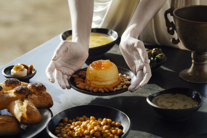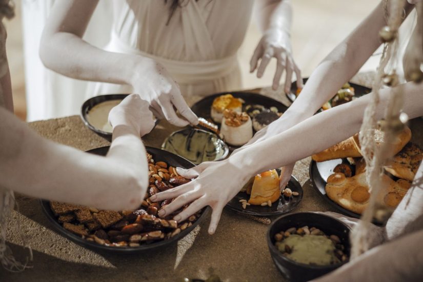 Si inizia dall’alimento principale delle nostre cene, quello che proprio non può mancare: il pane. Pane e cereali erano alla base dell’alimentazione dei Greci di Età Classica e ne esistevano di vari tipi per omaggiare Demetra, Dea delle messi e del raccolto. Le olive in salamoia costituivano uno stuzzicante abbinamento che preparava il palato al pasto. Ecco allora Sìtos, un pane friabile all’olio extravergine di oliva e rosmarino con olive verdi. Ma anche Àrtos, un pane croccante di grano antico con formaggio pecorino e salsiccia secca al finocchietto, condito con olio extravergine di oliva e origano rosso di Carcaci. Nelle feste, i riti e i banchetti, infatti, gli antichi greci amavano gustare cereali, formaggi e carni preparati in varie combinazioni. Immancabile era il condimento a base d’olio d’oliva e particolari erbe aromatiche. E parlando di pane non può mancare Boletìnos, soffice e caratteristico per la sua forma di fungo con sopra semi di papavero. Il Boletìnos era uno dei panetti più ambiti nei banchetti d’età classica. Una tradizione che ancora oggi continua nella panificazione artigianale siciliana, soprattutto nei panetti votivi.