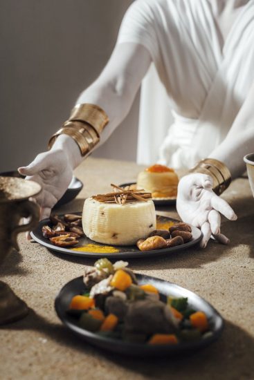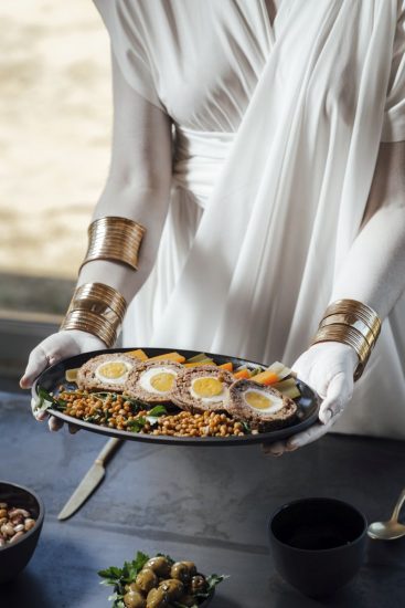 Si entra nel vivo della cena-evento con i piatti forse più originali de “Il Simposio degli Dei”, come Làganon, una zuppa croccante di pasta e legumi. Nel periodo in cui fu fondata Akragas, l’antica Agrigento, si sviluppò, insieme a quella del pane, la preparazione di questo tipo di pasta di cui gli antichi greci erano molto ghiotti. In qualche modo il progenitore della odierna arancina. Altra zuppa, ma questa volta di pesce su crema di farro: è Ichthyìa. Il pesce era presente sulle tavole degli antichi greci soprattutto nei banchetti. In questo caso abbinato a cereali, olio d’oliva ed erbe aromatiche, per una deliziosa unione tra divinità di terra e mare. Si prosegue con le Sardinee, sarde in agrodolce cucinate in foglie di vite. Un tipo di cottura molto utilizzato dagli antichi greci, per esaltare la sapidità del pesce e infondere un particolare aroma. E poi un piatto unico: Chytós, macco di fave con gàron. Il tipico macco di fave siciliano è un retaggio della cucina greca, una purea squisita e vellutata resa ancor più irresistibile dal gàron, una salsa di pesce simile all’odierna pasta di acciughe. Un abbinamento che, oggi come allora, crea una soave armonia tra dolcezza terrena e sapidità marina.
