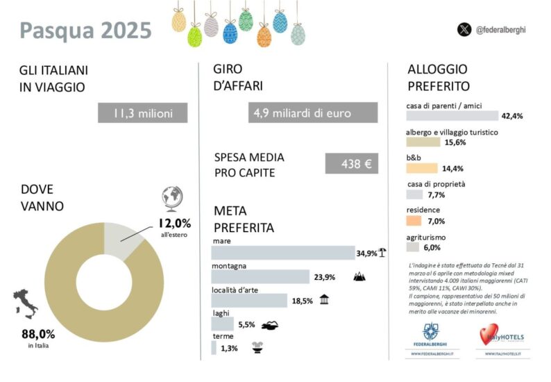 Il picco delle partenze è previsto per il Venerdì Santo, quando ben 5 milioni di italiani daranno il via al loro periodo di festa, con le sue tradizioni anche a tavola come la colomba pasquale. L’Italia, come sempre, resta la meta privilegiata per l’88% degli intervistati, anche se la possibilità di un “ponte” allungato spinge il 12% dei viaggiatori verso destinazioni internazionali. In particolare, secondo Federalberghi, le mete preferite per i viaggiatori che resteranno in Italia saranno il mare (34,9%), la montagna (23,9%), le località d’arte (18,5%) e, a seguire, i laghi (5,5%) e le località termali (1,3%). Per coloro che, invece, si recheranno all’estero, favoriti dalla vicinanza con i ponti primaverili, vincono le grandi capitali europee (76,6%), seguite da quelle extraeuropee (13,2%), dal viaggio in crociera (5,7%) e dalle località marine (4,5%). La motivazione principale per la scelta della destinazione sono le bellezze naturali del luogo (38,3%), mentre il 37,3% degli italiani approfitterà di questa occasione per raggiungere la propria famiglia. Altri motivi che orientano la scelta della vacanza sono la facilità di raggiungimento (35,4%) e la motivazione religiosa (20,1%).
