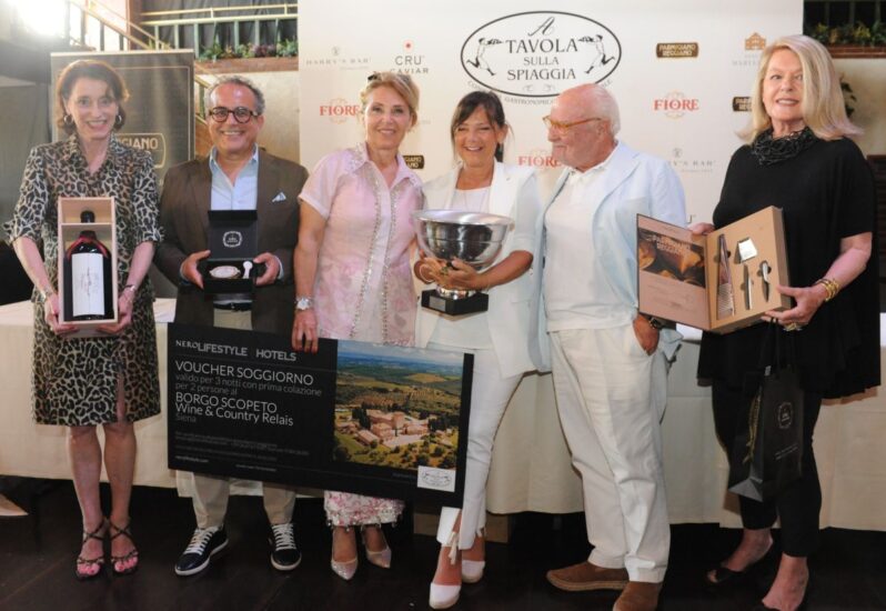 Il “Piatto Forte”, con lo Scolapasta d’oro di Petruzzi & Branca Argentieri e il Premio Cru Caviar (consistente in 100 grammi di prezioso caviale Beluga), è lo Stuzzicoso di Nonna Papera allo Scoppolato, spadellato con vino Lady F Orpicchio di Donne Fittipaldi, prodotto a Bolgheri, della designer di gioielli Lucia Giovannetti, primo Premio assoluto della Stampa, Premio Parmigiano Reggiano (in partnership con il Consorzio), Premio La Capannina e Premio Nero Lifestyle e Blastness, alla Zuppa inglese in campana di Marco e Elisabetta Rogai, “eno-pittrice”, abbinata ad un Florus 2020 di Castello Banfi: ecco i vincitori dell’edizione n. 32 di “A tavola sulla spiaggia”, nei giorni scorsi, sul palco della storica Capannina di Franceschi al Forte dei Marmi, che ha in visto in gara anche i premiati del passato dello storico evento che celebra che celebra il rito del “pranzo in bagno”, con il Concorso internazionale di enogastronomia, ideato da Gianni Mercatali, “una vita da pr” (che sulla storia del premio ha scritto anche un libro, per Gruppo Editoriale, ricordando concorrenti mitici come Ugo Tognazzi e Lino Banfi, Renato Pozzetto, Gino Paoli ed il pittore Fernando Botero, e giurati ome Sirio Maccioni e Tony May, Antonino Cannavacciuolo e Carlo Cracco, Davide Oldani, Cristiano Tomei ed Enzo Vizzari, tra gli altri). E che è stato il primo “talent” ad unire cucina, vino e il fascino glamour di una delle indiscusse mete mondane delle vacanze italiane, come la lunga spiaggia dorata della Versilia, che vanta una presenza concentratissima di ristoranti stellati ed è una “piazza mondiale” di consumo di grandi vini, grazie alla clientela internazionale (come abbiamo documentato con un video su WineNews).