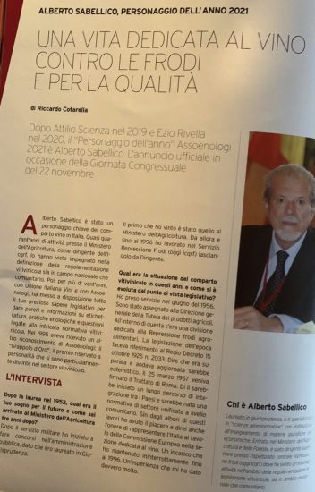 Alberto Sabellico è il “Personaggio dell’Anno 2021” per gli enologi italiani: dopo l’enologo-manager Ezio Rivella e il professor Attilio Scienza, ordinario di Viticoltura all’Università di Milano, è l’esperto in legislazione la personalità cui va il riconoscimento Assoenologi, annunciato oggi nel Congresso Nazionale 2020, di scena a Wine2Wine, business forum digital di Vinitaly & Veronafiere.