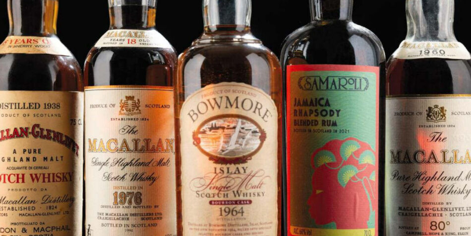 Ma spicca anche il lotto con sei bottiglie di Shiraz Grange 1999 di Penfolds (stima 1.400-1.800 euro) e le sei bottiglie di Napa Valley Opus One 2000 di Mondavi-Rothschild (base d’asta 1.600-2.200 euro). Anche se il top lot in assoluto dell’intero incanto è, in realtà, un distillato: si tratta di una bottiglia di whisky invecchiato 38 anni del 1964 dell’azienda scozzese Bowmore (base d’asta 8.000-12.000 euro), e da segnalare sono anche il Rum West Indies Dark 1948 di Samaroli (3.500-5.500 euro) ed il whisky invecchiato 35 anni del 1938 di Macallan-Glenlivet (2.500-3.600 euro).