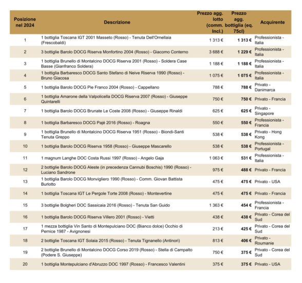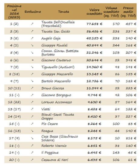 Nella “Top 20” delle tenute più apprezzate d’Italia è il Piemonte (13 su 20) ad avere la meglio sulla Toscana (7 su 20), ma i primi due posti sono per il “Granducato”. Guida, infatti, la Tenuta dell’Ornellaia (Frescobaldi) con 77.658 euro di valore scambiato, davanti alla Tenuta San Guido (56.456 euro), e ad Angelo Gaja (45.153 euro di valore scambiato). In “Top 10”, anche Giuseppe Rinaldi (40.899 euro), Comm. Giovan Battista Burlotto (21.296 euro), Giacomo Conterno (20.694 euro), Tignanello (Antinori) (19.360 euro), Giuseppe Mascarello (13.145 euro), Bartolo Mascarello (12.726 euro), e Bruno Giacosa (11.599 euro). Posizione n. 11 per Giacomo Borgogno (9.794 euro) e, a seguire, Lorenzo Accomasso (9.630 euro), Vietti (8.428 euro), Biondi-Santi Tenuta Greppo (8.410 euro), Pio Cesare (8.264 euro), Roagna (8.244 euro), Case Basse (Gianfranco Soldera) (8.175 euro), Roberto Voerzio (6.851 euro), Il Poggione (6.495 euro) e Casanova di Neri (6.435 euro).