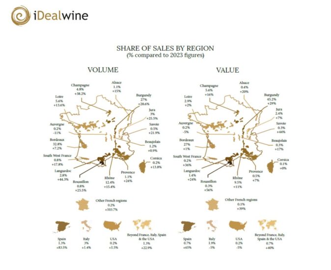 I valori generali sono in leggero calo sul 2023. Lo scorso anno si è infatti caratterizzato per un prezzo medio per bottiglia passato da 152 a 149 euro (-1,9%) anche se le variazioni di prezzo risultano contrastanti da una regione all’altra: ad esempio nella Champagne il prezzo medio a bottiglia ha subito una flessione del 16%, mentre il Roussillon ha registrato un aumento del 24%. La Borgogna ha continuato ad essere la regione leader con il 45,2% del valore e il 27% dei volumi aggiudicati su iDealwine. Bordeaux risulta sempre la prima regione per numero di bottiglie scambiate (32,8%), ma la seconda in termini di valore (27%), parametro che la vede in flessione così come la Valle del Rodano. L’Italia è in crescita ed è passata dall’1 al 2% del valore aggiudicato. Tuttavia, ha ricordato iDealwine, il valore aggiudicato nel corso dell’anno riguarda principalmente le 50 tenute più ricercate. Queste ultime, da sole, hanno rappresentato il 53% del valore totale aggiudicato nel 2024 su iDealwine e il 19% in termini di volume.