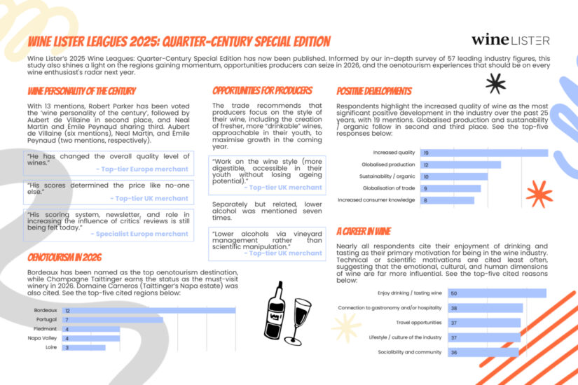 La crescita della qualità del vino, insieme all’espansione geografica della produzione e del mercato, sono stati i tratti distintivi di questo primo quarto di 21esimo secolo. Robert Parker, fondatore del “The Wine Advocate” del “100 point system”, è la personalità del secolo, mentre per il futuro le maggiori opportunità per i produttori verranno dal cambiamento dello stile dei prodotti (che dovranno essere sempre più eleganti, freschi, leggeri e più approcciabili dai consumatori), e dall’enoturismo. A patto che tutti lavorino per la difesa del valore culturale del vino, il cui elemento primario è quello della convivialità e della sua capacità di favorire l’incontro tra le persone. Ecco gli atout di “Wine Lister Leagues” 2025, il report di Wine-Lister (di proprietà di “Le Figaro Vin”), realizzato raccogliendo le opinioni di “57 Ceo, ad e responsabili dei reparti vino delle loro aziende, rappresentanti di ben oltre un terzo dei ricavi mondiali del fine wine”, spiega una nota, da cui, pur tra mille difficoltà, emerge il ritratto di “un’industria che continua a diversificarsi, ad ampliarsi e ad adattarsi, pur restando ancorata al significato culturale e alla connessione umana”, commenta Wine-Lister.