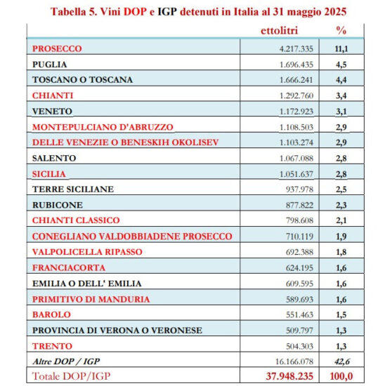 Il 58,3% del vino è detenuto nelle regioni del Nord, prevalentemente nel Veneto dove si trova il 26,1% del vino nazionale, soprattutto grazie al contributo delle giacenze delle province di Treviso (11,0%) e Verona (9,1%). Guardando alle Dop e Igp con “scorte” sopra al milione di ettolitri, come sempre guida il Prosecco Doc che, da solo, vale l’11,1% con 4,2 milioni di ettolitri, seguito da Igt Puglia (4,5% a 1,6 milioni di ettolitri), Igt Toscana (4,4% a 1,6 milioni), Chianti (3,4% a 1,3 milioni), Igt Veneto (3,1% a 1,2 milioni), Montepulciano d’Abruzzo (2,9% a 1,1 milioni), Doc Delle Venezie (2,9% a 1,1 milioni), Igt Salento (2,8% a 1 milione) e Doc Sicilia (2,8% a 1 milione di ettolitri).