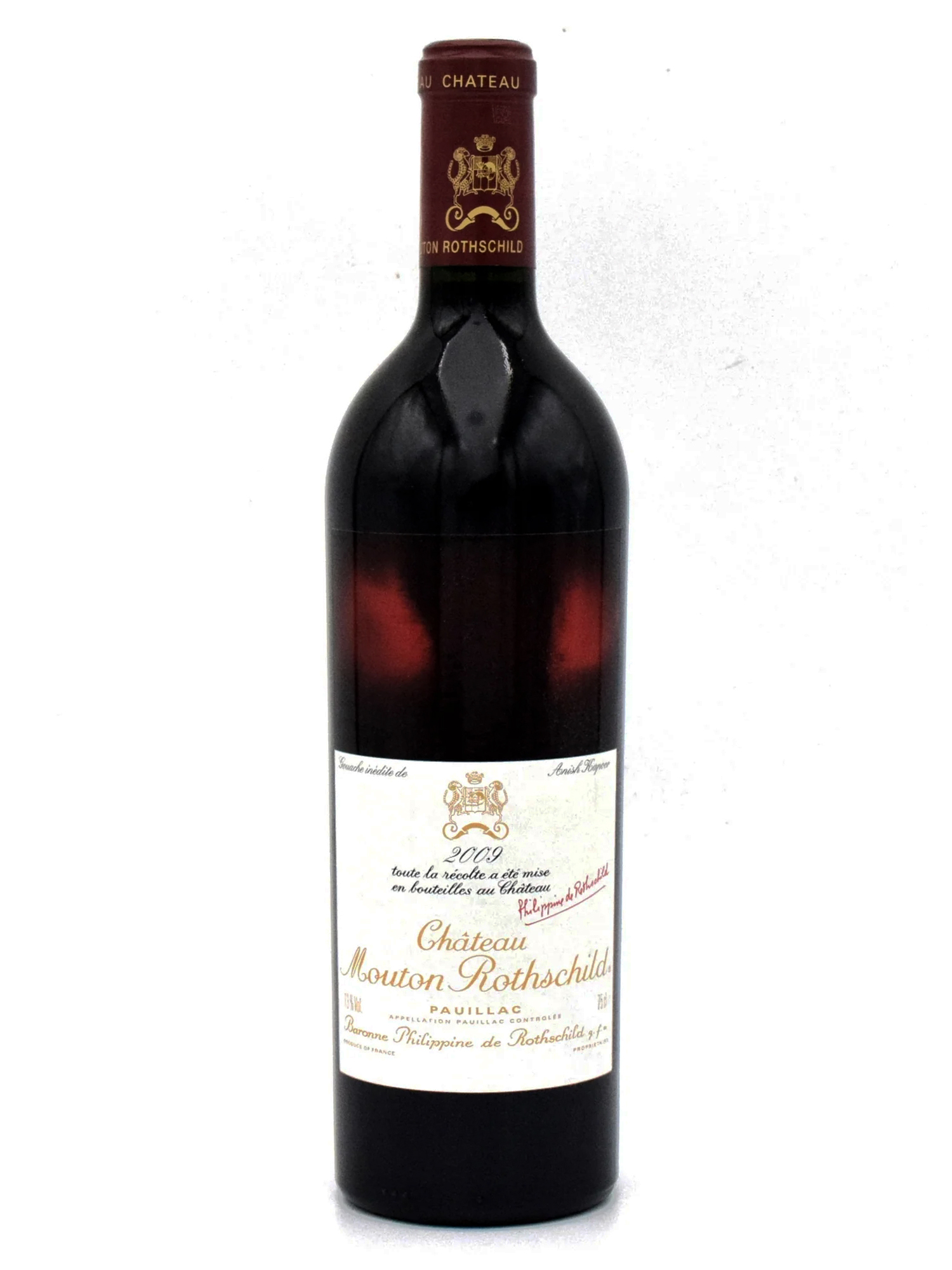 Premier Cru Classé dal 1973, unico caso di revisione della classificazione del 1855, Château Mouton Rothschild rappresenta una delle espressioni più autorevoli di Pauillac e della tradizione bordolese. Il 2009 a Pauillac è stato segnato da condizioni climatiche particolarmente favorevoli, con un ciclo vegetativo regolare e una maturazione completa delle uve. Dopo un inverno più freddo della media ma molto soleggiato, la primavera umida ha lasciato spazio a un’estate calda e asciutta, con stress idrico e forte insolazione. Le escursioni termiche di settembre hanno favorito concentrazione aromatica e accumulo di antociani, portando alla vendemmia, tra il 23 settembre e il 13 ottobre, grappoli sani, ricchi di zuccheri e colore. Il vino si presenta nel calice cupo e profondo, con un naso ampio e stratificato, dalle note di mirtillo, ribes nero e tabacco biondo, integrate da richiami di chinotto e spezie. Al palato mostra densità ed evoluzione, con frutto maturo ben fuso a tannini spessi e levigati che definiscono una struttura solida e armonica. Il finale è lungo, scuro e di grande continuità aromatica, espressione compiuta di un’annata tra le più rilevanti del millennio recente. L’etichetta è firmata da Anish Kapoor, che interpreta il millesimo con una gouache intensa, giocata sull’interazione tra materia e luce, in continuità con la tradizione artistica che dal 1945 accompagna ogni vendemmia di Mouton Rothschild.