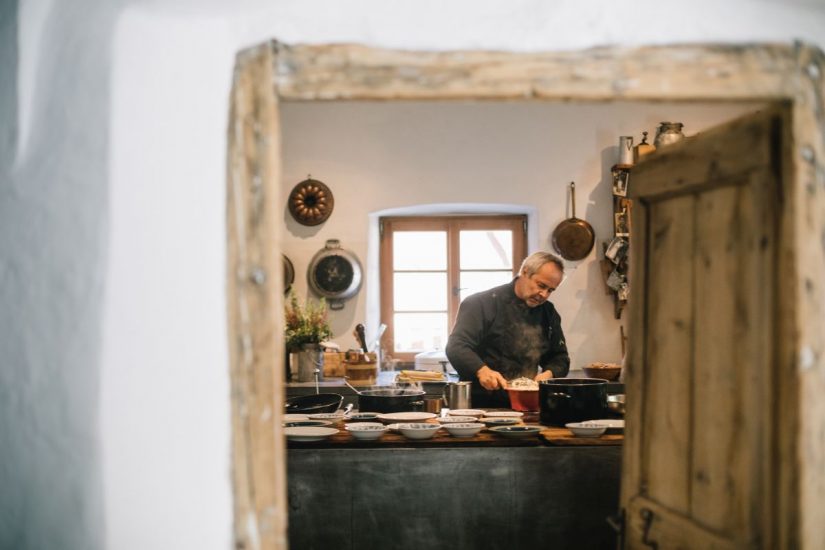 “È il prodotto la star, non il cuoco!”: guidato da tale convinzione, lo chef Peter Girtler si gode le 2 stelle Michelin guadagnate alla Einhorn Stube del Romantik Hotel Stafler di Mules, a Vipiteno, dove utilizza i prodotti a chilometro zero dell’azienda agricola della famiglia Stafler, ortaggi del proprio orto biologico e forniture di contadini locali e altoatesini per creare piatti unici nel segno del motto “massimo rispetto per il prodotto”. Appassionato di verdure ormai dimenticate e puntiglioso nell’assicurarsi che il percorso di frutta e ortaggi dal luogo di coltivazione sia il più breve possibile, lo chef può contare su un allevamento di 85 mucche da latte che vivono pacifiche nella stalla “compost” sostenibile e di ultima generazione dei masi dell’hotel.