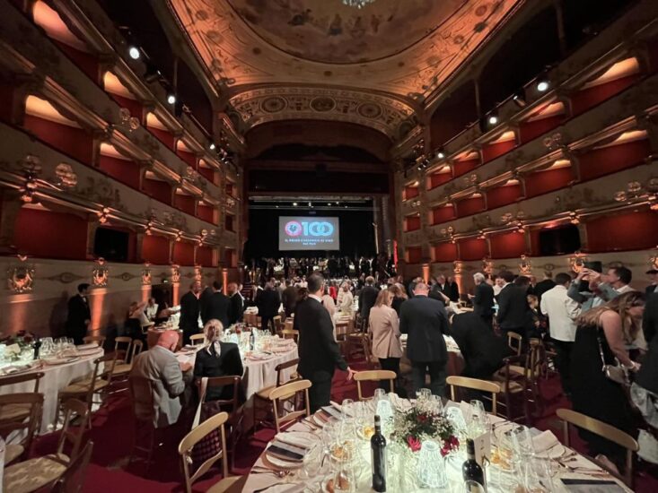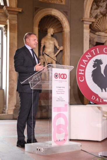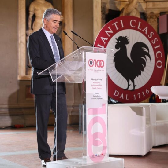 Uno dei territori più iconici e rinomati del mondo, sinonimo di blasone e prestigio, ma anche per numeri ed immagine, tra Firenze “culla” del Rinascimento, e Siena, città medievale per eccellenza, e che, per molti, è anche il più bello, tanto da esser candidato all’Unesco (con il “Sistema delle Ville Fattorie nel Chianti Classico”), con un fascino capace di penetrare, ciclicamente, nelle nuove generazioni di wine lovers anche perché in grado di identificarsi con una regione, la Toscana, che vanta pochi eguali a livello paesaggistico, culturale e, ovviamente, nella produzione di grandi vini rossi. Questo è il Chianti Classico, 6.800 ettari vitati di bellezza, 486 produttori, di cui 345 fanno l’intera filiera, 35-38 milioni di bottiglie l’anno che finiscono in 160 Paesi del mondo, Usa, Italia e Canada in testa, per un valore economico di distretto che, con il vino come perno, è stimabile intorno a 1 miliardo di euro. Un appeal crescente, come dimostrano anche i 7 vini del territorio inseriti nella “Top 100” 2023 by “Wine Spectator”, e con un posizionamento sempre più alto sui mercati, effetto di un prezzo medio cresciuto del 7% nel 2023 sul 2022, e del 13% sul 2021, anche grazie all’effetto traino della “Gran Selezione”, il vertice della piramide qualitativa del Chianti Classico (composta da Riserva ed Annata) ed essenza dell’essenza del territorio (che, nel 2024, festeggia 10 anni dall’arrivo sul mercato) alla quale, con la vendemmia 2023, si sono aggiunte le 11 Unità Geografiche Aggiuntive in etichetta (realizzate dal cartografo del vino Alessandro Masnaghetti con Enogea, ndr) a conferma di un territorio, quello del Gallo Nero, che guarda al futuro con fiducia e la serenità dei numeri, nonostante, a livello globale, il mercato sembra non sorridere più come prima ai vini rossi. Ma la storia ha sempre il suo peso, e quella del Consorzio del Chianti Classico è iniziata 100 anni fa, ovvero il 14 maggio 1924, grazie a 33 lungimiranti viticoltori che decisero di investire nell’aggregazione perché solo così si poteva gestire una produzione che potesse parlare “di” e “ad” un intero territorio. Le origini del “mito”, però, partono da molto più lontano, dal bando del Granduca di Toscana Cosimo III de’ Medici che delimitava pionieristicamente la zona di produzione del Chianti Classico nel 1716, proseguendo con l’invenzione della “formula perfetta” del Chianti Classico da parte del “Barone di Ferro” Bettino Ricasoli nel Castello di Brolio nel 1872. Ed eccoci ad oggi, con la celebrazione “secolare” dalla fondazione del Consorzio più antico d’Italia: quello del Chianti Classico, che ha ripercorso il passato e guardato al futuro dal Salone dei Cinquecento a Palazzo Vecchio a Firenze, dove è raffigurato, con il suo simbolo, il Gallo Nero, dal grande pittore Giorgio Vasari nel soffitto tra le allegorie dei domini dei Medici.