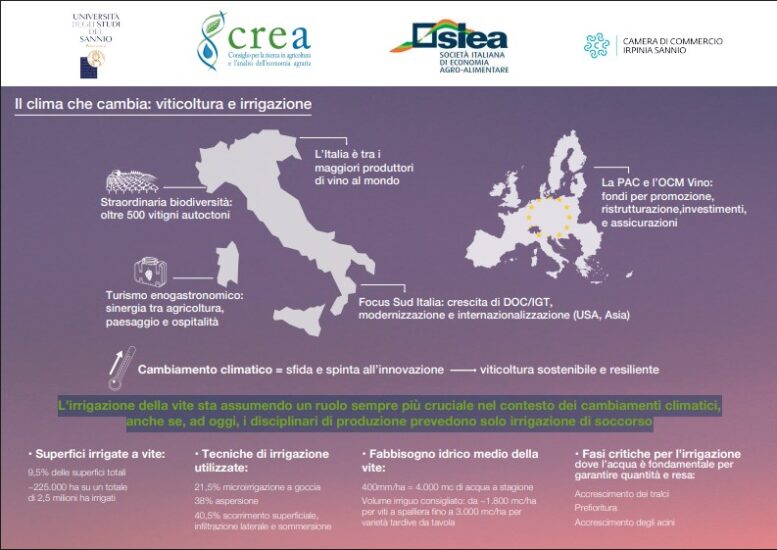 Una delle sfide più complicate, ma decisive, che sta affrontando la viticultura è quella relativa al cambiamento climatico. E lo si può vedere anche nell’estate in corso con le temperature altissime che hanno fatto preoccupare alcuni territori, così come le repentine e violente precipitazioni successive alle ondate di calore. Ecco che, per contrastare il “climate change”, il mondo del vino guarda sempre di più all’innovazione con l’obiettivo di ottenere una viticoltura sostenibile e resiliente. Un tema affrontato dal Crea, in occasione del convegno “Gestione delle risorse idriche per una viticoltura sostenibile”, organizzato con il Centro Politiche e Bioeconomia, Università del Sannio, Camera di Commercio Irpinia Sannio e Siea (Società Italiana di Economia Agroalimentare), per “Territori, Cibo e Società: tra sfide globali e complessità”, rassegna di eventi, nei giorni scorsi a Benevento, promossa da Società Italiana di Economia Agraria (Sidea), Siea e Centro Studi di Estimo e di Economia territoriale (Ceset).