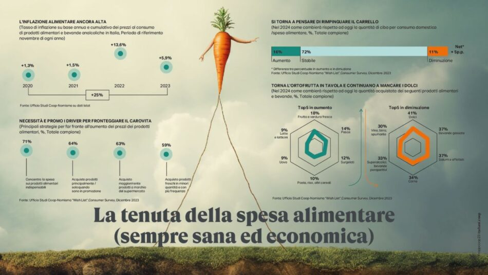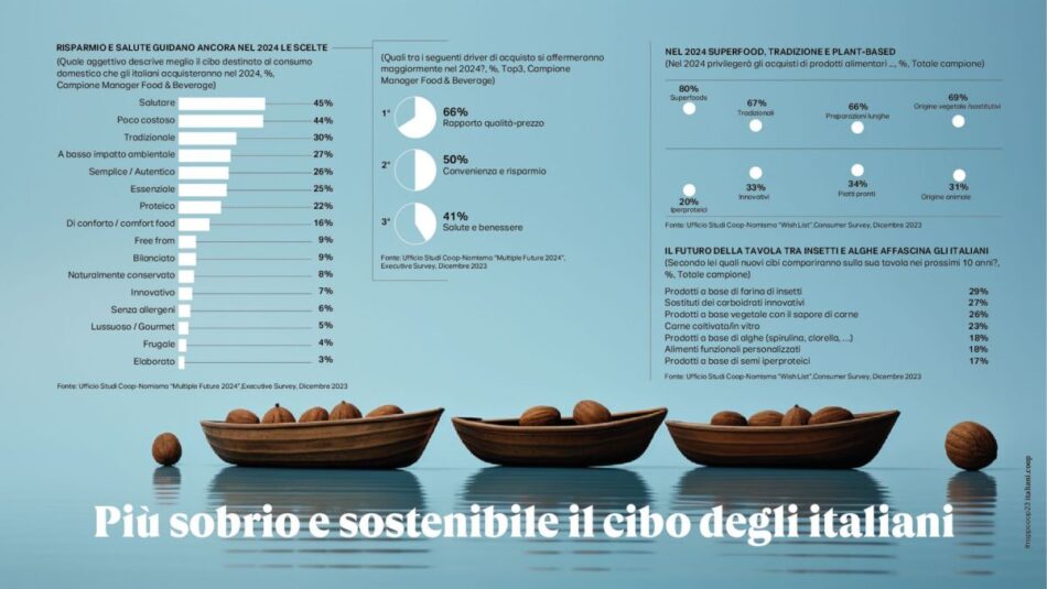 Tra gli aggettivi scelti dagli italiani per definire il cibo del 2024 il più gettonato è salutare (45%), poi poco costoso (44%), seguito da sostenibile (27%), semplice/autentico (26%) ed essenziale (25%). Perché oltre ad essere conveniente, la tavola del nuovo anno deve rimanere “healthy”, quindi tradizionale e semplice (27%). Nella “top 5” dei prodotti in aumento al primo posto tornano ad esserci frutta e verdura (18%), dopo che nell’estate sembravano essere state al centro di grandi rinunce da parte degli italiani, seguite da pesce (14%), anch’esso una difficile rinuncia degli ultimi anni, surgelati (12%), pasta, riso e altri cereali (10%), uova (9%) e latte e latticini (9%). Nella “top 5” dei prodotti di cui gli italiani prevedono di poter ridurre i consumi spiccano, invece, dolci (li ridurrà il 41% del campione), bevande gassate (37%), salumi e affettati (37%), carni rosse (34%), superalcolici e bevande per aperitivi (33%), ma anche vino, birra e spumante (30%, come nel 2023, secondo i dati di Circana, analizzati da WineNews, ndr). Sono queste le previsioni dell’Ufficio Studi Coop, frutto di indagini condotte a dicembre 2023 (aspettando la versione integrale del “Rapporto Coop” 2023 su italiani.coop il 13 gennaio), e secondo le quali, se i manager della filiera alimentare ipotizzano anche per il 2024 una nuova piccola contrazione degli acquisti alimentari nella gdo (-0,5% a volume), sembrano invece migliorare le intenzioni di spesa degli italiani sui consumi alimentari domestici con la percentuale di quanti intendono aumentare le quantità consumate (16%) che supera quella di quanti intendono ridurre i consumi (11%, con una differenza di 5 punti percentuali, che era di -1 punto percentuale ad agosto 2023), mentre il 72% dichiara che rimarranno stabili. Il cibo resta, dunque, centrale nelle scelte di consumo, ma anche a tavola, la tenuta della spesa si sposa con la sobrietà. Infatti, quasi un terzo degli italiani (31%) dichiara che dedicherà più tempo alla preparazione domestica del cibo (il modo più semplice per coniugare qualità e risparmio) e in ogni caso i principali driver di acquisto sono il rapporto qualità-prezzo al primo posto (almeno per il 66% degli italiani), la convenienza e il risparmio (50%), e la salute e il benessere (41%).