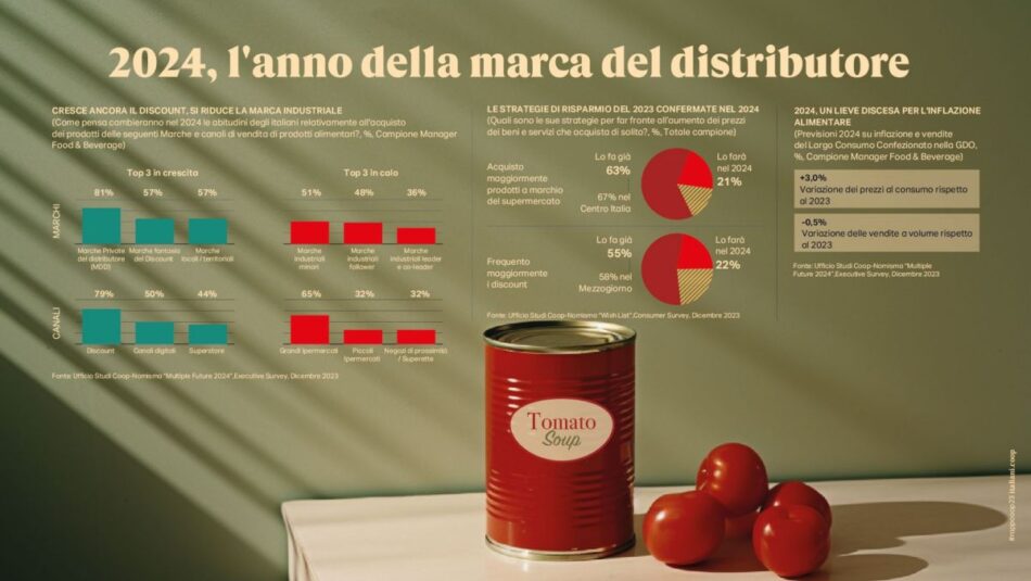 Sul fronte macroeconomico, se la recessione appare oramai come scongiurata, le previsioni 2024 delle indagini dell’Ufficio Studi Coop - la prima, “Wish List”, condotta in collaborazione Coop-Nomisma e realizzata con metodo Cawi a dicembre, ha coinvolto un campione di 1.000 individui rappresentativo della popolazione 18-65 anni, la seconda, “Multiple Future 2024” è stata rivolta alla community del sito di italiani.coop, 700 opinion leader e market maker fruitori delle passate edizioni del Rapporto Coop - ci riportano in un’Italia dello zero virgola. Secondo i manager intervistati la crescita del Pil stimata allo 0,5% per i prossimi 12 mesi ci rende comunque più lenti dell’Europa, e l’83% dello stesso campione è convinto che le sacche di povertà e i fenomeni di vulnerabilità sociale e economica nel nostro Paese siano destinati a aumentare. A fronte di un’inflazione alimentare ancora sostenuta (per i manager stimata al 3% nella media d’anno), nel tentativo dunque di difendere i propri consumi e la loro qualità, gli italiani sembrano essersi definitivamente convertiti alla Mdd (Marca del distributore) che anche nel 2024 promette di registrare ottime performance, con l’82% dei manager italiani che prevede un aumento della quantità acquistata, mentre al primo posto tra le scelte di acquisto in riduzione si trovano le marche industriali. Non solo quelle minori e dei produttori follower (in calo rispettivamente per il 51% e il 48% degli intervistati), non fanno eccezione nemmeno le marche leader, tanto che un buon 36% ne immagina la rinuncia all’acquisto. E come conferma il 21% dei consumatori che nel 2024 acquisterà maggiormente prodotti a marchio del supermercato.