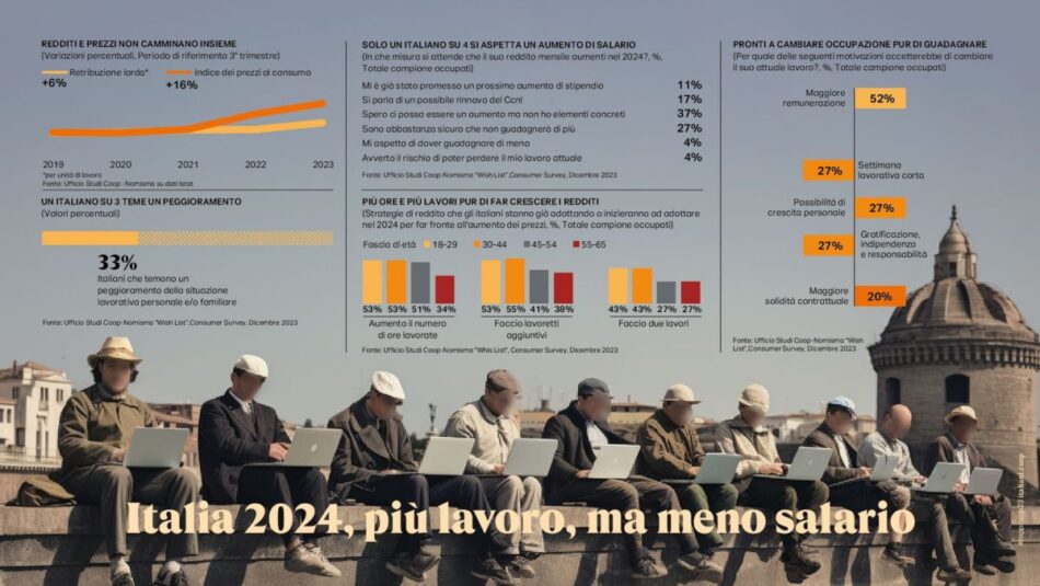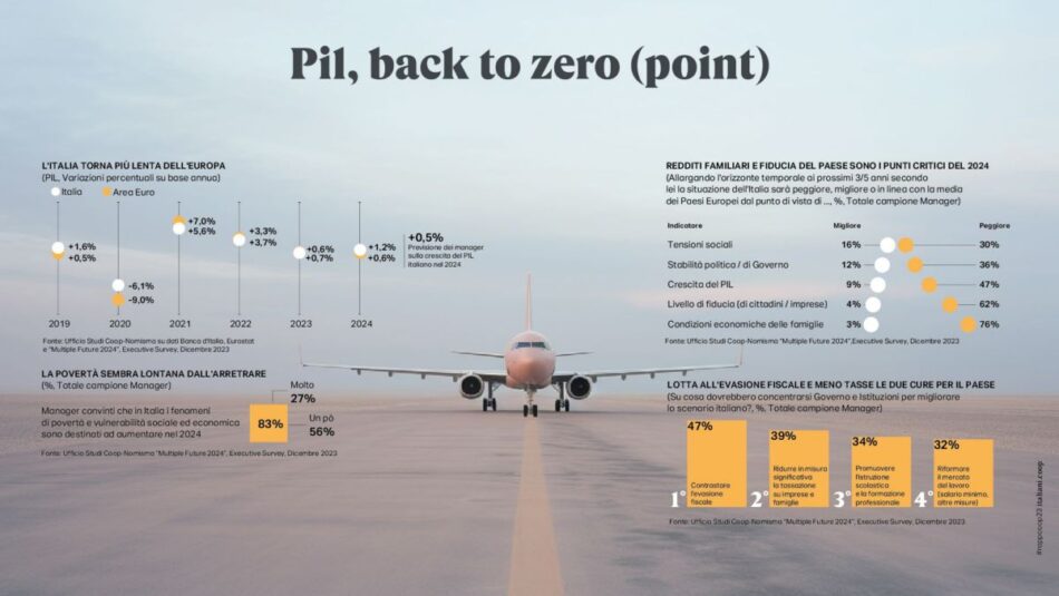 Reduci da un anno difficile e a tratti drammatico - dal nuovo scenario di guerra israelo-palestinese, alle catastrofi climatiche fino alla concreta perdita di potere d’acquisto - gli italiani si affacciano con una salda imperturbabilità sull’orlo di un 2024 in cui tra incerte tornate elettorali, nuove tensioni geopolitiche e il rallentamento delle economie globali, saranno ancora molte le occasioni che potrebbero cambiare i destini del mondo. Nel contesto globale, secondo i manager italiani intervistati dall’Ufficio Studi Coop a dicembre, ancor più dell’economia il maggior elemento di instabilità dello scenario globale nei prossimi 12 mesi saranno proprio i potenziali nuovi conflitti: li teme il 45% del campione a fronte di un 23% preoccupato dai fenomeni climatici estremi e di un 22% allarmato dall’andamento dell’economia internazionale. E tra gli elementi di maggiore preoccupazione figurano proprio gli esiti delle molte tornate elettorali, a partire da quella americana (è quanto dichiara il 44% del campione). Volatilità dello scenario e molteplici crisi potenziali che fanno sì che il futuro non possa che essere declinato al plurale, generando un sovrapporsi di molti mondi possibili. Improvvisi, imprevedibili, forse anche distopici.