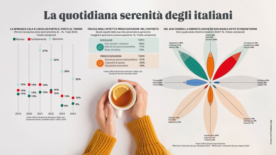In questo contesto non può che sorprendere la calma olimpica dei nostri connazionali. La fotografia degli italiani scattata dalle survey dell’Ufficio Studi Coop ci consegna infatti l’immagine di un Paese in pausa, annidato nel proprio presente, dove non albergano rabbia o disperazione, ma dove anzi persistono, in linea con l’ultimo anno, stati d’animo positivi. Gli italiani trovano conforto nella dimensione intimistica della loro sfera privata, della famiglia e degli affetti più vicini e sembrano invece aver dovuto rinunciare alla speranza di potersi costruire un futuro migliore. La speranza (parola spesso associata nelle rilevazioni precedenti all’anno che verrà) viene citata da poco più di un quinto degli italiani (22%), erano un quarto un anno fa (26%), ma quasi 4 su 10 (37%) alle soglie del 2022 post pandemico (indagine di dicembre 2021). E allo stesso modo viene meno la previsione di un concreto cambiamento che passa dal 15% del 2022, al 13% del 2023 e si ferma al 12% del 2024. Tra le parole che più tendono a connotare l’anno appena iniziato trovano spazio serenità (33%) e accettazione (28%). Una propensione positiva che si fa strada però non senza sacrifici.