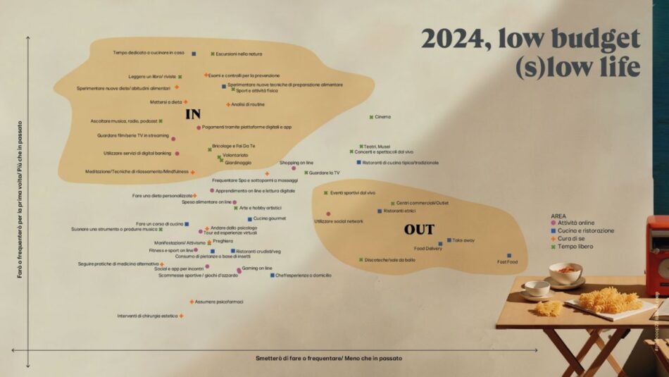 In questo contesto in cui molte variabili di miglioramento delle proprie vite sono indisponibili, l’attenzione non può che essere riposta appunto sulla cura degli affetti, di sé e degli altri. Tra le due sole voci di spesa in cui il numero di italiani che prevedono per il 2024 un aumento supera quanti prevedono una diminuzione compaiono proprio le spese per la salute e benessere (in aumento per il 24% del campione) e quelle per il consumo alimentare domestico (16%). Il 26% degli intervistati dichiara di voler spendere di più in prevenzione e controlli, il 23% in analisi di routine. Il 23% mette tra i buoni propositi per il 2024 la solita dieta, ma il 25% pensa a nuove abitudini alimentari e il 17% ragiona su Spa, meditazione e tecniche di rilassamento. Perché la vera chiave di volta dell’anno da poco iniziato è una vita low budget, tutta vissuta giorno per giorno, forse l’unica che la maggioranza degli italiani possa permettersi. Preoccupati come sono dall’erosione dei loro risparmi con cui hanno attutito l’impatto dell’inflazione degli ultimi 20 mesi e coscienti che ci vorrà tempo prima che i loro salari aumentino. Così il tempo libero fa mettere in stand by cinema, teatri, concerti e musei (tutti con dei costi), a favore di passeggiate nella natura, lettura, qualche sport e un po’ di musica (con costi decisamente più ridotti).