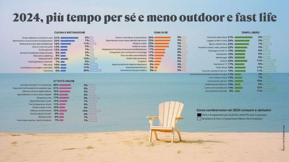 Piccola eccezione, almeno sulla carta, la voglia di vacanza. Dopo che nel 2023 molti avevano lasciato la valigia in soffitta chi per problemi di budget chi per contingenze climatiche, tra i propositi per il 2024, crescono coloro che pensano di tornare a viaggiare in Italia (il 68% con 8 punti percentuali in più sul 2023), o a viaggiare all’estero (42% con 7 punti percentuali in più sullo scorso anno).