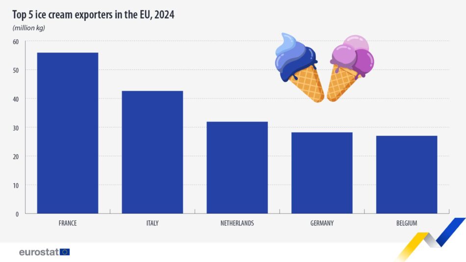 Sul fronte del commercio, l’Ue ha esportato 265,3 milioni di kg di gelato verso Paesi extra-Ue (+2,8 milioni di kg con un aumento del +1%) e ne ha importati 69,3 milioni (+13,6 milioni di kg con aumento del +24%). La Francia si conferma il principale esportatore con 55,9 milioni di kg, pari al 21% delle esportazioni extra-Ue, seguita da Italia (42,6 milioni di kg, pari al 16% delle esportazioni extra-Ue), Paesi Bassi (31,9 milioni di kg, pari al 12% delle esportazioni extra-Ue), Germania (28,2 milioni di kg, pari all’11% delle esportazioni extra-Ue) e Belgio (27 milioni di kg, pari al 10% delle esportazioni extra-Ue).
