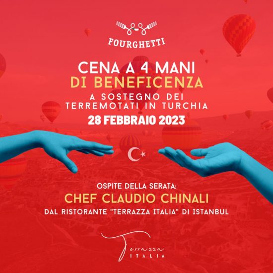 Fourghetti non è nuovo a questo tipo di iniziative solidali e anche questa volta apre le sue porte per far fronte a questa emergenza umanitaria, un contributo dato attraverso l’ideazione di un evento unico che vedrà cucinare a quattro mani lo chef Lavacchielli insieme allo chef Chinali, due amici uniti per la solidarietà dopo il terremoto che ha colpito la Turchia e la Siria. Fourghetti propone una cucina ricca di contaminazioni, fortemente legata al territorio emiliano romagnolo, ma con sfumature dei Paesi arabi e del basso Mediterraneo. Terrazza Italia è un viaggio nel gusto tradizionale del Belpaese oltreconfine, combinato alla varietà delle materie prime turche.