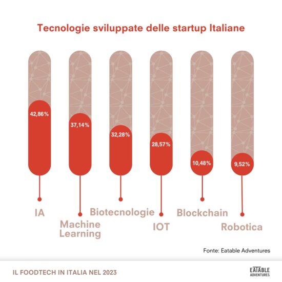 Per l’identikit delle startup italiane foodtech, il Nord del Paese domina incontrastato il panorama delle startup in Italia: un terzo (30,5%) ha sede in Lombardia, regione che precede l’Emilia-Romagna (11,1%), Piemonte, Veneto e Lazio, da cui ne provengono, a pari merito, il 10%. Inoltre, il 50% delle startup totali, è nato tra il 2022 (25,3%) e il 2023 (22,8%), evoluzione di un fenomeno partito nel 2018 (7,6%) che, dal 2021, ha registrato una vera e propria impennata (19,1%), fino a toccare l’apice nel 2022. Un aumento non solo dovuto al crescente interesse, nel ricorrere all’innovazione per fornire risposte alle consistenti sfide della filiera agroalimentare ed ai cambi nelle tendenze di consumo, ma anche alla nascita di iniziative di supporto dell’ecosistema e di nuovi strumenti di investimento per le realtà emergenti. Guardando alla composizione delle startup, si riscontrano team compatti da uno a cinque dipendenti per il 69% del campione, fino a un massimo di sei-dieci dipendenti per il 13%. L’età media è di 35,6 anni, con un ruolo fondamentale da parte delle donne, ben il 32% delle startup sono state infatti fondate da una o più imprenditrici femminili (il dato nazionale è del 10% del totale, mentre per i team misti non si supera il 16%). Sono quattro le categorie individuate da Eatable Adventures nell’analisi dello stato del Foodtech in Italia: Agritech (tecnologie applicate all’agricoltura), Produzione e Trasformazione Alimentare, Retail & Distribuzione (tra cui rientano, tra gli altri, robotica applicata, piattaforme di analisi retail, nuovi canali di vendita) e Restaurant Tech & Delivery (come le piattaforme di prenotazione e gestione, robot di cucina). Le startup si concentrano principalmente nel segmento Produzione e Trasformazione Alimentare (36%), seguito dall’Agritech (22,3%), Restaurant Tech & Delivery (22%) e, infine, Retail & Distribuzione (19,6%). Quasi la metà delle startup (il 43%) attive nella Produzione e Trasformazione Alimentare si concentra sulla realizzazione di nuovi prodotti con ingredienti innovativi, mentre tra quelle attive nell’Agritech il 33% ha sviluppato nuovi sistemi di coltivazione o sistemi di automazione delle colture (31,5%). Altro dato interessante è che il 66% del campione sviluppa internamente le proprie tecnologie, senza avvalersi di collaborazione con terze parti: solo il 12% ha cooperato con le Università, il 2% con poli tecnologici e il 13% con altre aziende esterne. Questo significa che il 70% delle startup mostra un livello di sviluppo autonomo notevolmente elevato, evidenziando una solida maturità tecnologica.