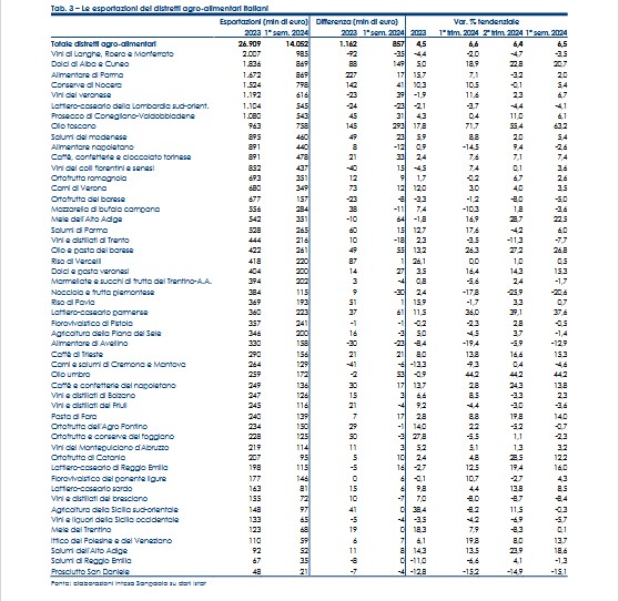 In territorio positivo anche la filiera del caffè (+10% tendenziale nel primo semestre 2024): bene il Caffè, confetterie e cioccolato torinese (+7,4%). Positivi anche il Caffè di Trieste (+15,3%) e il Caffè e confetterie del napoletano (+13,8%).