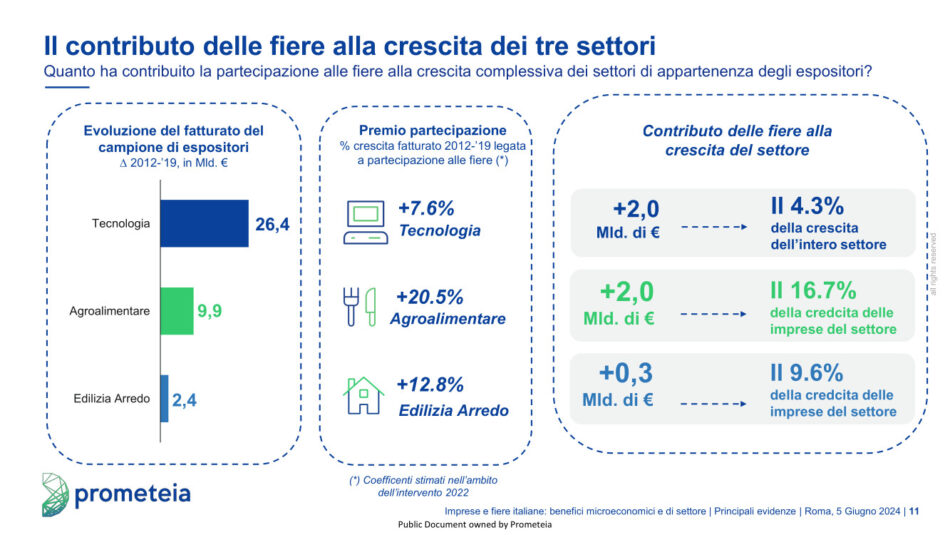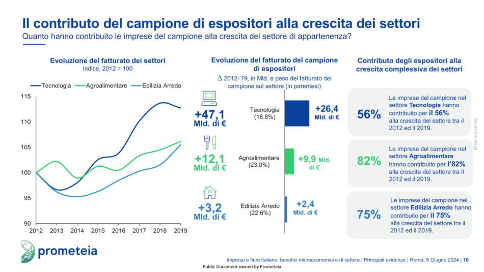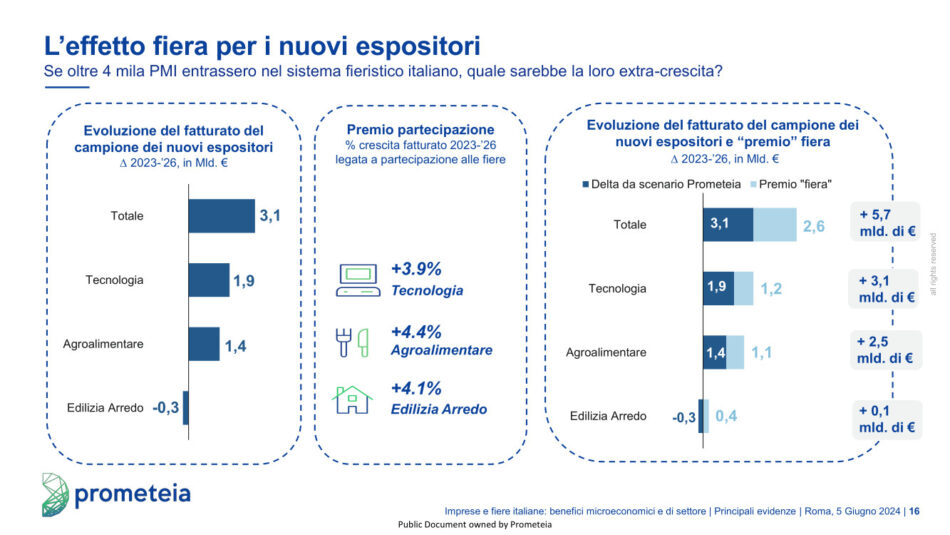 L’effetto fiera, conclude il report, potrà rivelarsi ancora più incisivo per i tre settori. L’ingresso di 4.150 nuove piccole medie imprese nell’Associazione porterebbe infatti un beneficio di un altro +0,6% sull’aumento complessivo di fatturato (+56 miliardi di euro) con un incremento ascrivibile alla sola partecipazione fieristica che si attesterebbe a +5,7 miliardi di euro, anziché 3,1. L’agroalimentare chiuderebbe il 2026 a +20 miliardi. Il comparto tecnologico invece a +39 miliardi, stabile edilizia e arredo.