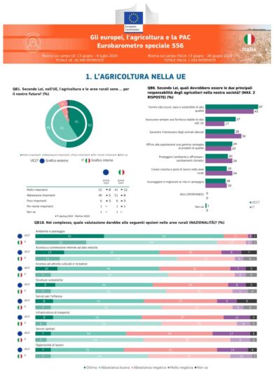 Un giudizio positivo, sulla Pac e l’agricoltura, arriva, come detto in precedenza, anche a livello generale, da tutti i Paesi della Ue. La maggior parte dei cittadini ritiene che l’Ue, attraverso la Pac, stia svolgendo il suo ruolo nel garantire un approvvigionamento alimentare stabile in ogni momento (81%). Inoltre, circa 7 intervistati su 10 ritengono che la Pac contribuisca alla gestione sostenibile delle risorse naturali (72%), allo sviluppo di soluzioni digitali e di ricerca a sostegno dei settori agricolo e alimentare (71%), oltre al rafforzamento del ruolo degli agricoltori nella filiera alimentare (70%). Ma anche a stimolare gli investimenti, la crescita e creare posti di lavoro (70%), contribuire ad affrontare i cambiamenti climatici (70%) e garantire prezzi alimentari ragionevoli (69%). La maggioranza degli intervistati ritiene che la Pac aiuta a ridurre le disparità regionali (66%) e incoraggia i giovani ad entrare nel settore agricolo (63%). In termini di priorità e aspettative, per gli intervistati è importante garantire un approvvigionamento alimentare stabile in ogni momento (94%), ma anche prezzi alimentari ragionevoli per i consumatori (92%) e una gestione sostenibile delle risorse naturali (91%), rafforzando il ruolo degli agricoltori nella catena alimentare (90%).