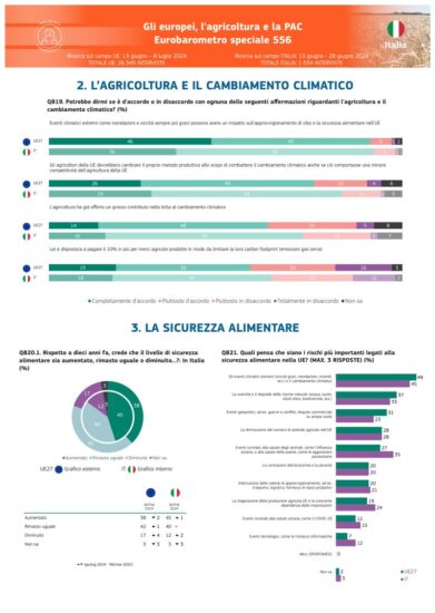 Gli italiani sono tra i più positivi. Non a caso affermano che l’agricoltura e le aree rurali, per il futuro dell’Ue, saranno “molto importanti” per il 41% degli intervistati (anche se sono il 12% rispetto a febbraio/marzo 2022) contro il 52% della media europea, e “abbastanza importanti” per il 51%. Il 63% degli italiani (+13% sul dato 2022), ha già sentito parlare del supporto fornito dalla Ue agli agricoltori tramite la Pac (65% la media europea), pur non conoscendone realmente i dettagli, mentre il 7% ne ha una conoscenza approfondita (13% la media europea). La “pagella” della Politica agricola comune per gli italiani è eccellente. L’Ue, attraverso la Pac, sta assicurando una fornitura stabile di cibo per l’82% degli italiani, ma anche cibo sano, sicuro e di alta qualità per il 77%, garantisce un modo sostenibile per produrre di cibo (78%), protegge l’ambiente e affronta il cambiamento climatico (80%), assicura un equo tenore di vita agli agricoltori (74%) e che i consumatori abbiano generi alimentari a prezzi ragionevoli (74%), crea crescita e posti di lavoro nelle aree rurali (73%). Un sentiment, per ogni risposta, ancora migliore della media europea. Il 36% degli italiani, contro il 46% della media europea, è “completamente d’accordo” che eventi climatici estremi come inondazioni e siccità, sempre più gravi, possono avere un impatto sull’approvvigionamento di cibo e la sicurezza alimentare nell’Ue (il 56% è piuttosto d’accordo). Rispetto a dieci anni fa, il 45% degli italiani pensa che il livello di sicurezza alimentare sia aumentato, mentre il 40% sostiene che è rimasto uguale e vede negli eventi climatici estremi o in quelli correlati alla salute degli animali (influenza aviaria) o delle piante (le aggressioni parassitarie) i rischi più importanti legati alla sicurezza alimentare. Per quanto riguarda gli aiuti che l’Ue eroga agli agricoltori (e che coprono circa il 30% del budget totale dell’Unione Europea), gli italiani giudicano questi aiuti “giusti” (62%, +9% sul 2022), ma un 26% (-8% sul 2022) sostiene sono “troppo bassi”. Per Coldiretti e Filiera Italia, “il favore, mai così alto, registrato tra gli italiani per la Politica agricola comune conferma la centralità dell’agricoltura nel futuro dell’Unione Europea e la convinzione comune che le campagne svolgano un ruolo insostituibile per garantire la sovranità alimentare, anche rispetto ai rischi di guerre e carestie”.