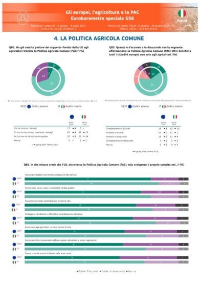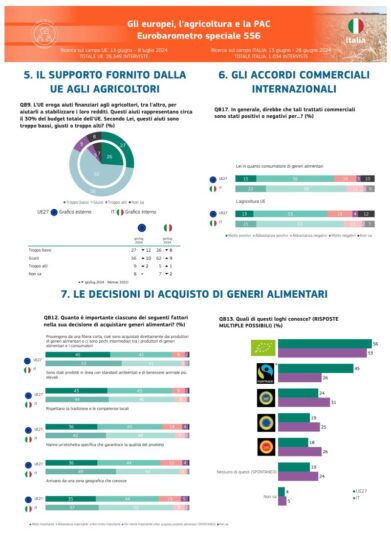Gli accordi commerciali dell’Ue incontrano il giudizio positivo degli europei, un’ampia maggioranza ritiene che apportino benefici significativi all’agricoltura e ai consumatori dell’area. In particolare, il 76% concorda sul fatto che tali accordi garantiscano la diversificazione dei mercati e dell’approvvigionamento di prodotti agricoli nell’Ue. Per il 73% questi accordi commerciali rafforzano le esportazioni di prodotti agricoli Ue in tutto il mondo e promuovano le norme Ue in materia di lavoro e ambiente, compreso il benessere degli animali per la produzione agricola in altri paesi (71%). Per quanto riguarda la conoscenza dei marchi di qualità europei, la maggior parte dei cittadini (56%, 53% per gli italiani) riconosce il logo dell’agricoltura biologica, mentre i loghi Igp (24%) e della Dop (18%) potrebbero beneficiare di un riconoscimento più ampio anche se in Italia la loro notorietà è maggiore, 31% per l’Igp e 26% per la Dop.