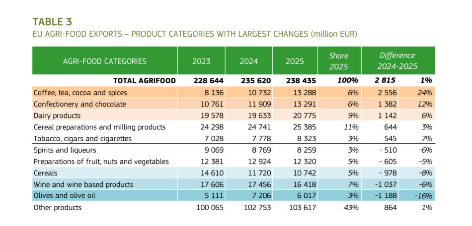 L’Ue ha di fatto consolidato la sua posizione esportatore leader agroalimentare, risultando l’unico tra i primi 5 esportatori mondiali ad aver aumentato il valore delle proprie esportazioni. L’aumento dei prezzi ha incrementato il valore delle esportazioni di prodotti a base di cacao, caffè, cioccolato e prodotti lattiero-caseari. Il valore dell’olio d’oliva esportato è diminuito a causa dei prezzi più bassi, mentre i volumi di vino e cereali sono calati. Complessivamente, la maggiore crescita del valore delle importazioni ha portato ad un calo della bilancia commerciale agroalimentare dell’Ue a 49,9 miliardi di euro, per -13,3 miliardi di euro sul 2024, anche se il surplus commerciale dell’Ue rimane 4 volte superiore a quello del 2002. Nel 2025, il commercio agroalimentare ha rappresentato il 9% delle esportazioni totali dell’area e il 7,5% delle importazioni totali.