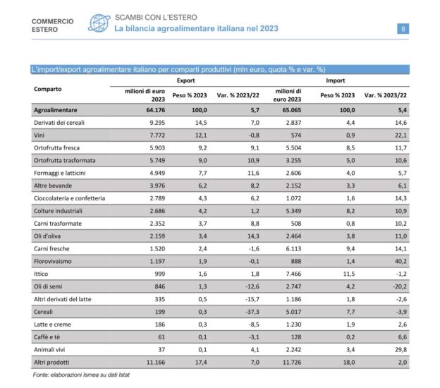 Nonostante inflazione, tensioni e guerre, nel 2023 le esportazioni dell’agroalimentare italiano hanno toccato un nuovo record, superando i 64 miliardi di euro, con una crescita del 5,7% sul 2022. Risultato importante, e che fa crescere l’ambizione di arrivare a 100 miliardi di euro nel medio termine, come ricordato dal presidente Confagricoltura, Massimiliano Giansanti. Nel frattempo, però, l’Italia resta un importatore netto, visto che l’import di prodotti agroalimentari ha superato di poco i 65 miliardi di euro, con una crescita del 5,4% sul 2022, con il saldo della bilancia commerciale, dunque, leggermente peggiorato, dato che il disavanzo nel 2023 si è attestato a 889 milioni di euro, riducendosi di 126 milioni di euro sull’anno precedente. Le esportazioni italiane sono aumentate per tutti i principali prodotti, con l’unica eccezione dei vini in bottiglia che, dopo il buon risultato del 2022, hanno visto ridurre il valore delle spedizioni a 5,1 miliardi di euro (-2,7%,), su un totale enoico di 7,7 miliardi di euro, sebbene i vini spumanti si siano distinti per la crescita (+3,3% in valore), sottolinea Ismea. Il vino rimane comunque saldamente al primo posto tra i prodotti esportati con un peso sul totale del 7,9%, e anche quello con il miglior saldo commerciale positivo, a 7,19 miliardi di euro, a fronte di appena 574 milioni di importazioni. Tra gli altri comparti di peso rilevante, le esportazioni dei derivati di cereali (a 9,2 miliardi di euro) aumentano dell’8%, trainate soprattutto dai prodotti della panetteria e della pasticceria (+12%) più che dalle paste alimentari (+1,3%), e con un saldo attivo di 7 miliardi di euro. Meglio ancora, in termini di crescita delle esportazioni fanno l’ortofrutta fresca (+9,1%) e trasformata (+10,9%), i formaggi e latticini (+11,6%) e l’olio d’oliva (+14%).