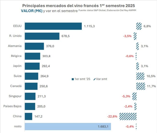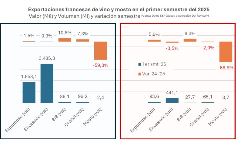 Mentre i consumi interni in Gdo, termometro per il settore, sono in calo, le esportazioni del vino francese nel primo semestre 2025 “sono sostanzialmente stabili”. A fronte, infatti, di una perdita del -1,8% in volume, l’export in valore cresce del +0,9%, per un totale di 628,2 milioni di litri e un fatturato pari a 5,5 milioni di euro. Sono i numeri analizzati e pubblicati dal Centro studi spagnolo “Del Rey Analists of Wine Market”, che, vista anche l’altalena dell’export vinicolo transalpino (giù durante la pandemia nel 2020, in crescita nel 2021, di nuovo al ribasso tra 2022 e metà 2024 e stabile tra fine 2024 e il 2025) e il contesto di diminuzione del consumo di vino mondiale, valuta “ragionevolmente positivi” i dati delle esportazioni Oltralpe.